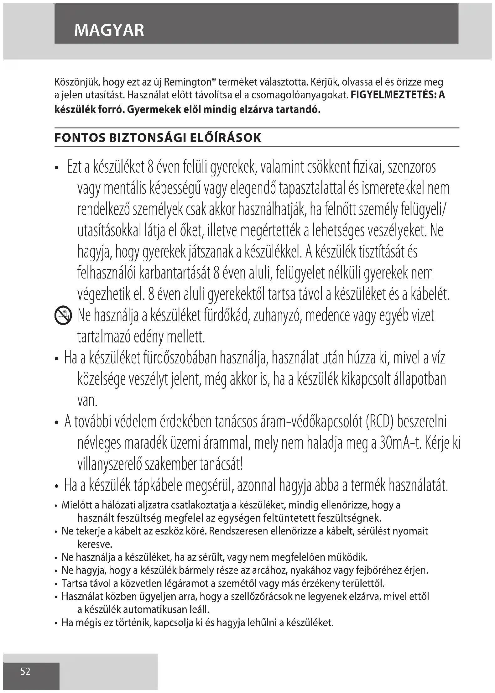 AE52 Köszönjük, hogy ezt az új Remington® terméket választotta. Kérjük, olvassa el és őrizze meg a jelen utasítást. Használat előtt távolítsa el a csomagolóanyagokat. FIGYELMEZTETÉS: A készülék forró. Gyermekek elől mindig elzárva tartandó.
