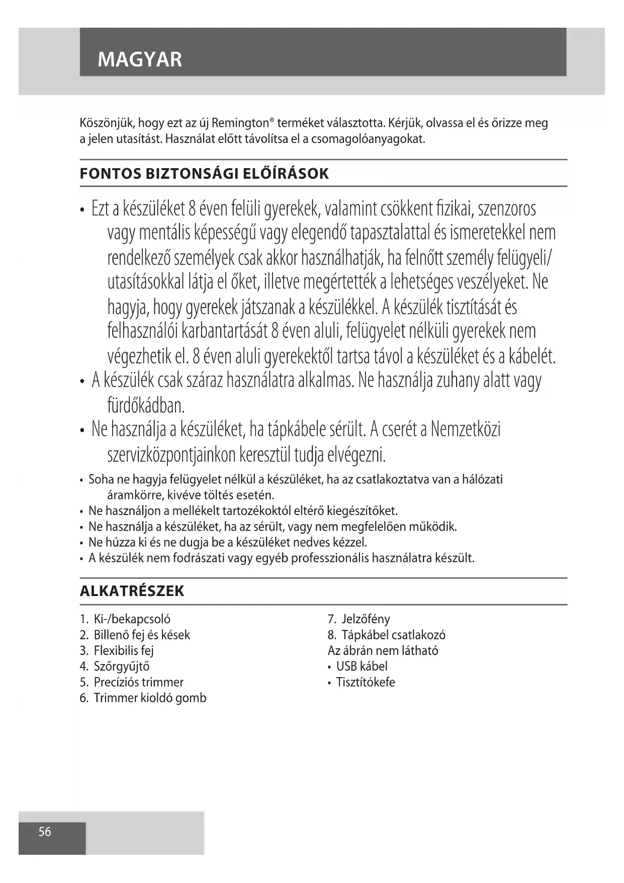 AE56 Köszönjük, hogy ezt az új Remington® terméket választotta. Kérjük, olvassa el és őrizze meg a jelen utasítást. Használat előtt távolítsa el a csomagolóanyagokat.