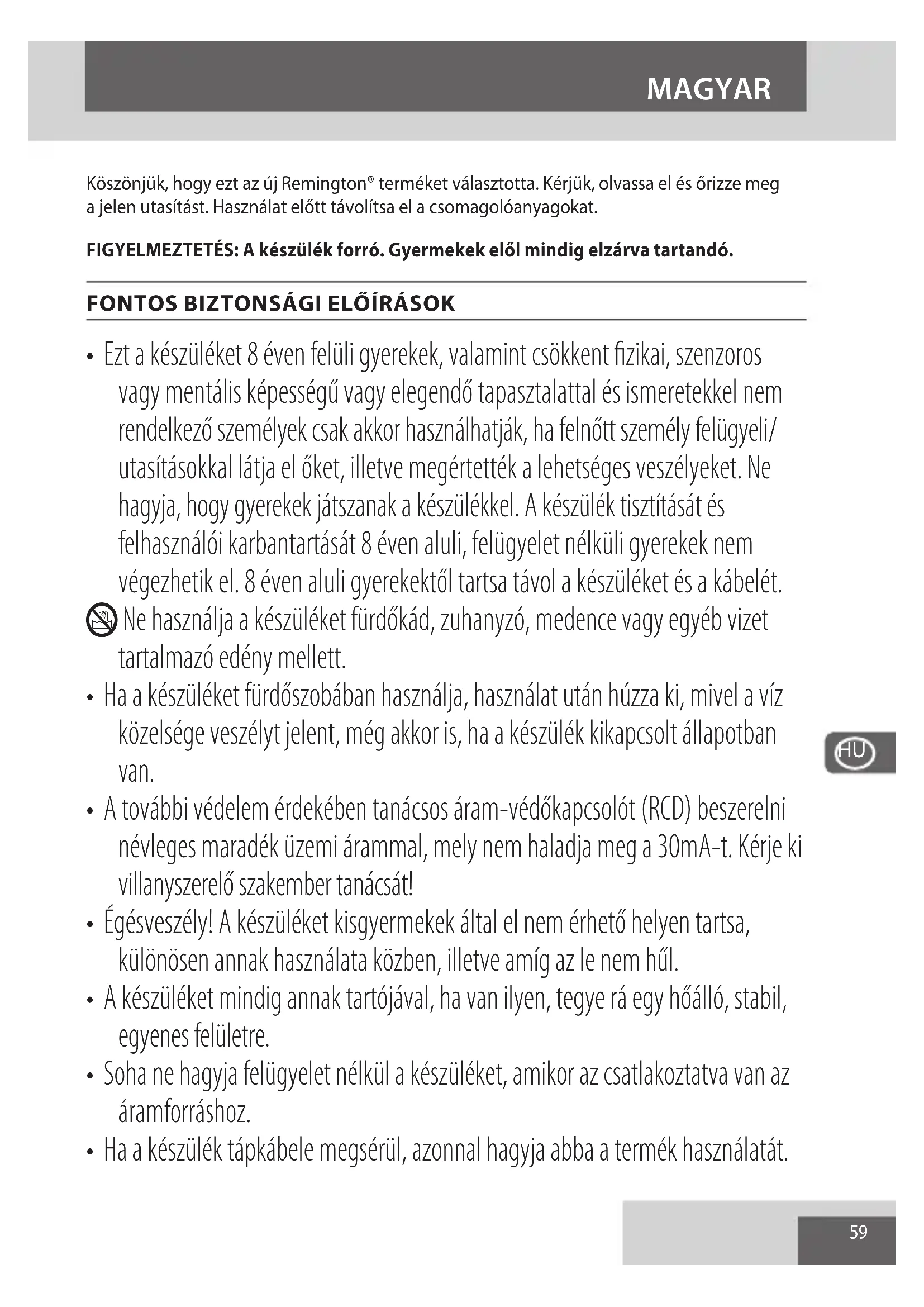 - Ezt a készüléket 8 éven felüli gyerekek, valamint csökkent fizikai, szenzoros vagy mentális képességű vagy elegendő tapasztalattal és ismeretekkel nem rendelkező személyek csak akkor használhatják, ha felnőtt személy felügyeli/ utasításokkal látja el őket, illetve megértették a lehetséges veszélyeket. Ne hagyja, hogy gyerekek játszanak a készülékkel. A készülék tisztítását és felhasználói karbantartását 8 éven aluli, felügyelet nélküli gyerekek nem végezhetik el. 8 éven aluli gyerekektől tartsa távol a készüléket és a kábelét. L Ne használja a készüléket fürdőkád, zuhanyzó, medence vagy egyéb vizet tartalmazó edény mellett.