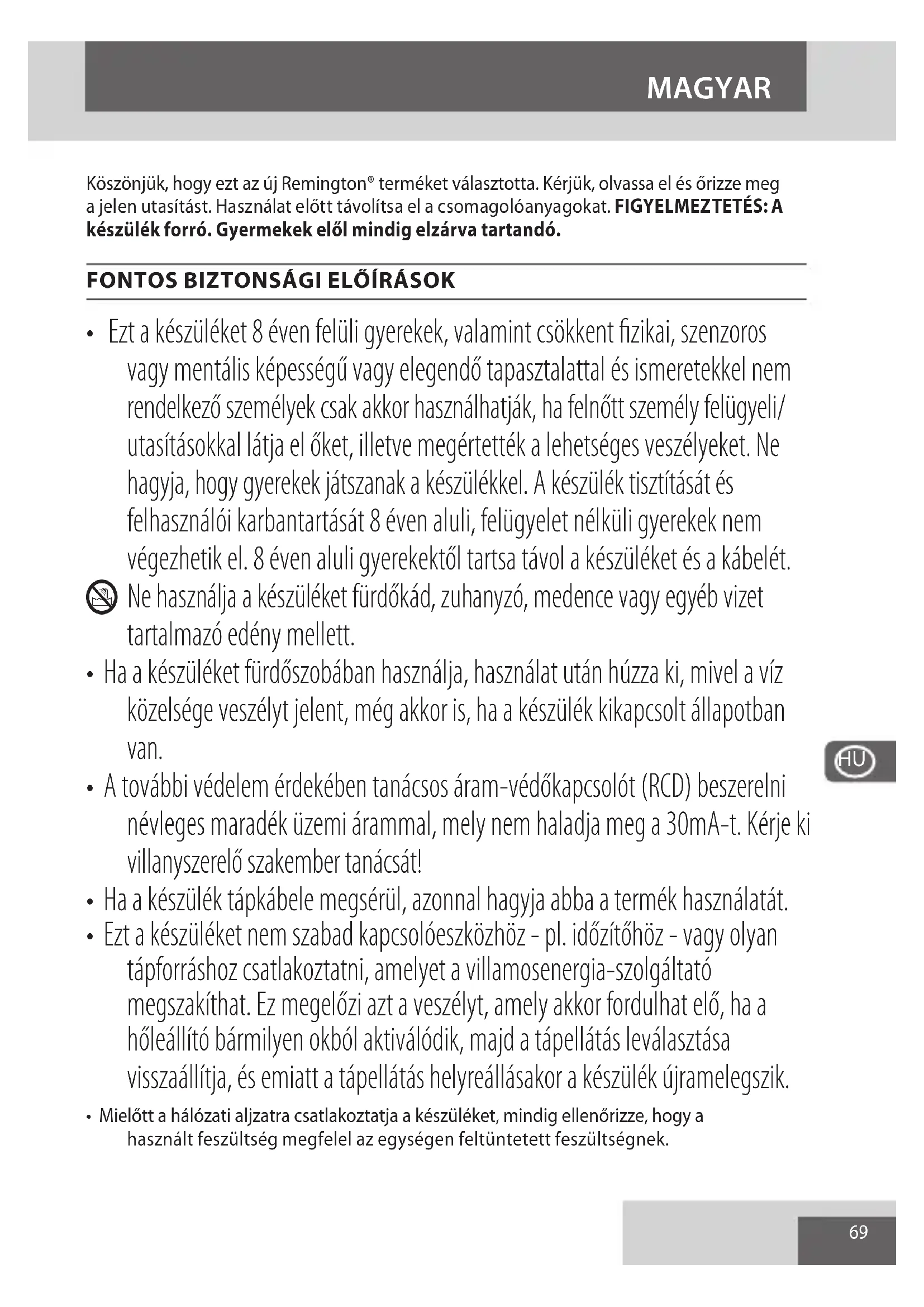 - Ezt a készüléket 8 éven felüli gyerekek, valamint csökkent fizikai, szenzoros vagy mentális képességű vagy elegendő tapasztalattal és ismeretekkel nem rendelkező személyek csak akkor használhatják, ha felnőtt személy felügyeli/ utasításokkal látja el őket, illetve megértették a lehetséges veszélyeket. Ne hagyja, hogy gyerekek játszanak a készülékkel. A készülék tisztítását és felhasználói karbantartását 8 éven aluli, felügyelet nélküli gyerekek nem végezhetik el. 8 éven aluli gyerekektől tartsa távol a készüléket és a kábelét. L Ne használja a készüléket fürdőkád, zuhanyzó, medence vagy egyéb vizet tartalmazó edény mellett.