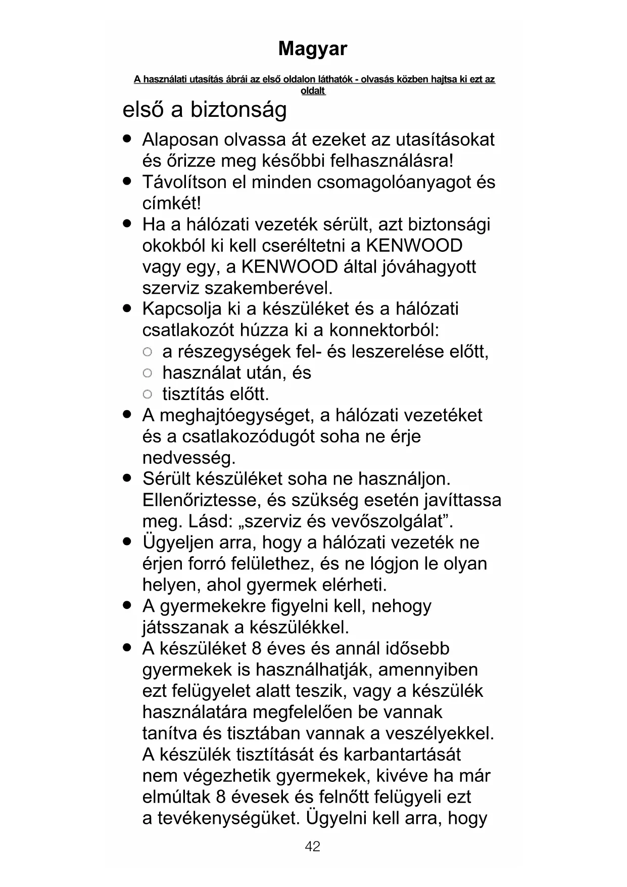 A készüléket csak a rendeltetésének megfelelő háztartási célra használja! A Kenwood nem vállal felelősséget, ha a készüléket nem rendeltetésszerűen használták, illetve ha ezeket az utasításokat nem tartják be. fontos figyelmeztetés