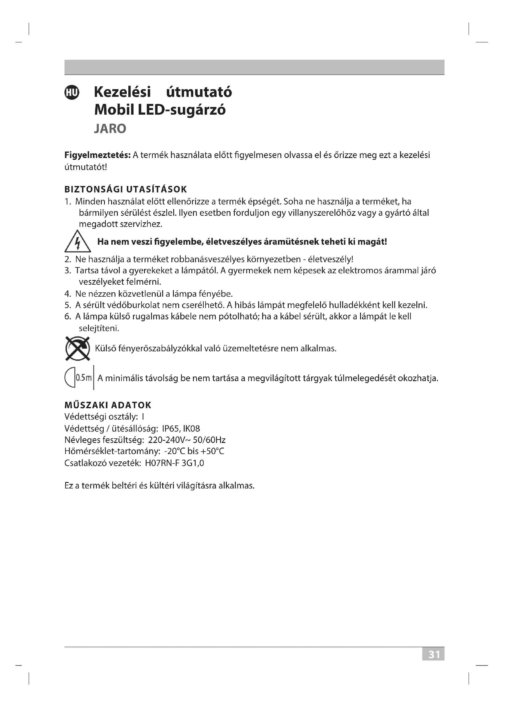 Védettségi osztály: I Védettség / ütésállóság: IP65, IK08 Névleges feszültség: 220-240V~ 50/60Hz Hőmérséklet-tartomány: -20°C bis +50°C Csatlakozó vezeték: H07RN-F 3G1,0 Ez a termék beltéri és kültéri világításra alkalmas. 20P117 Mobiler LED Strahler Jaro 10-50W 0533125 210409.indd 31 09.04.2021 13:15:363232 Kezelési útmutató JARO ÜZEMBEHELYEZÉS Állítsa a fényszórót száraz, sima felületre. A sugárzó dőlésszöge beállítható. Oldja ki ehhez az oldalsó gyorsrögzítőt, fordítsa a lámpafejet a megfelelő helyzetbe, majd szorítsa meg újra a gyorsrögzítőt. KEZELŐ ELEMEK Hordfogantyú Gyorsrögzítő Állvány