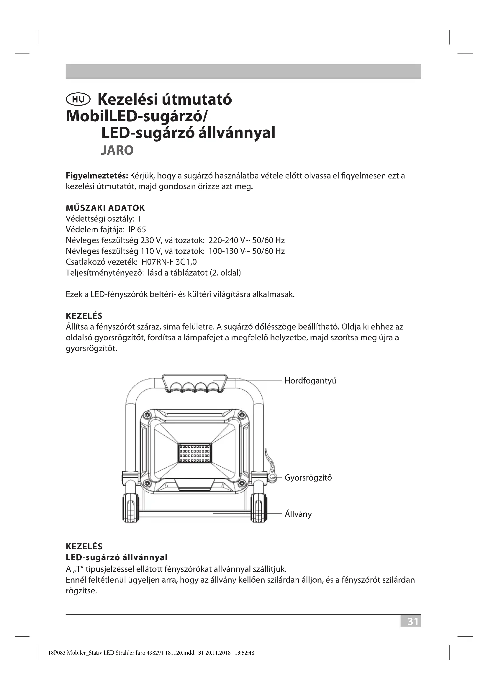 Védettségi osztály: I Védelem fajtája: IP 65 Névleges feszültség 230 V, változatok: 220-240 V~ 50/60 Hz Névleges feszültség 110 V, változatok: 100-130 V~ 50/60 Hz Csatlakozó vezeték: H07RN-F 3G1,0 Teljesítménytényező: lásd a táblázatot (2. oldal) Ezek a LED-fényszórók beltéri- és kültéri világításra alkalmasak. KEZELÉS Állítsa a fényszórót száraz, sima felületre. A sugárzó dőlésszöge beállítható. Oldja ki ehhez az oldalsó gyorsrögzítőt, fordítsa a lámpafejet a megfelelő helyzetbe, majd szorítsa meg újra a gyorsrögzítőt. Gyorsrögzítő Állvány Hordfogantyú KEZELÉS LED-sugárzó állvánnyal A „T” típusjelzéssel ellátott fényszórókat állvánnyal szállítjuk. Ennél feltétlenül ügyeljen arra, hogy az állvány kellően szilárdan álljon, és a fényszórót szilárdan rögzítse. 18P083 Mobiler_Stativ LED Strahler Jaro 498291 181120.indd 31 20.11.2018 13:52:4832
