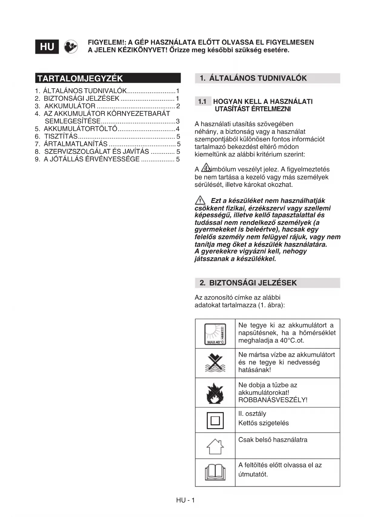 - Ha a külső burkolat eltörik és az akkumulátorban levő vegyi anyagok a bőrrel érintkeznek: – azonnal mossa le szappannal és vízzel. – semlegesítse citromlével, ecettel vagy egyéb enyhe savval.