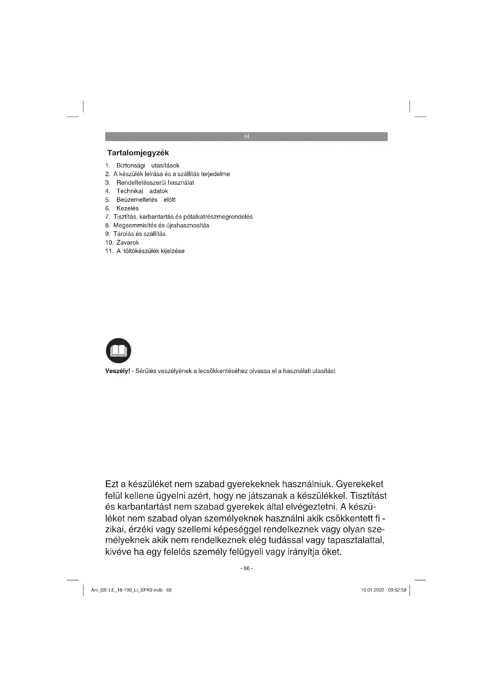Veszély! - Sérülés veszélyének a lecsökkentéséhez olvassa el a használati utasítást Ezt a készüléket nem szabad gyerekeknek használniuk. Gyerekeket felül kellene ügyelni azért, hogy ne játszanak a készülékkel. Tisztítást és karbantartást nem szabad gyerekek által elvégeztetni. A készü- léket nem szabad olyan személyeknek használni akik csökkentett fi - zikai, érzéki vagy szellemi képeséggel rendelkeznek vagy olyan sze- mélyeknek akik nem rendelkeznek elég tudással vagy tapasztalattal, kivéve ha egy felelős személy felügyeli vagy irányítja őket. Anl_GE-LE_18-190_Li_SPK9.indb 66Anl_GE-LE_18-190_Li_SPK9.indb 66 10.01.2022 09:52:5810.01.2022 09:52:58H