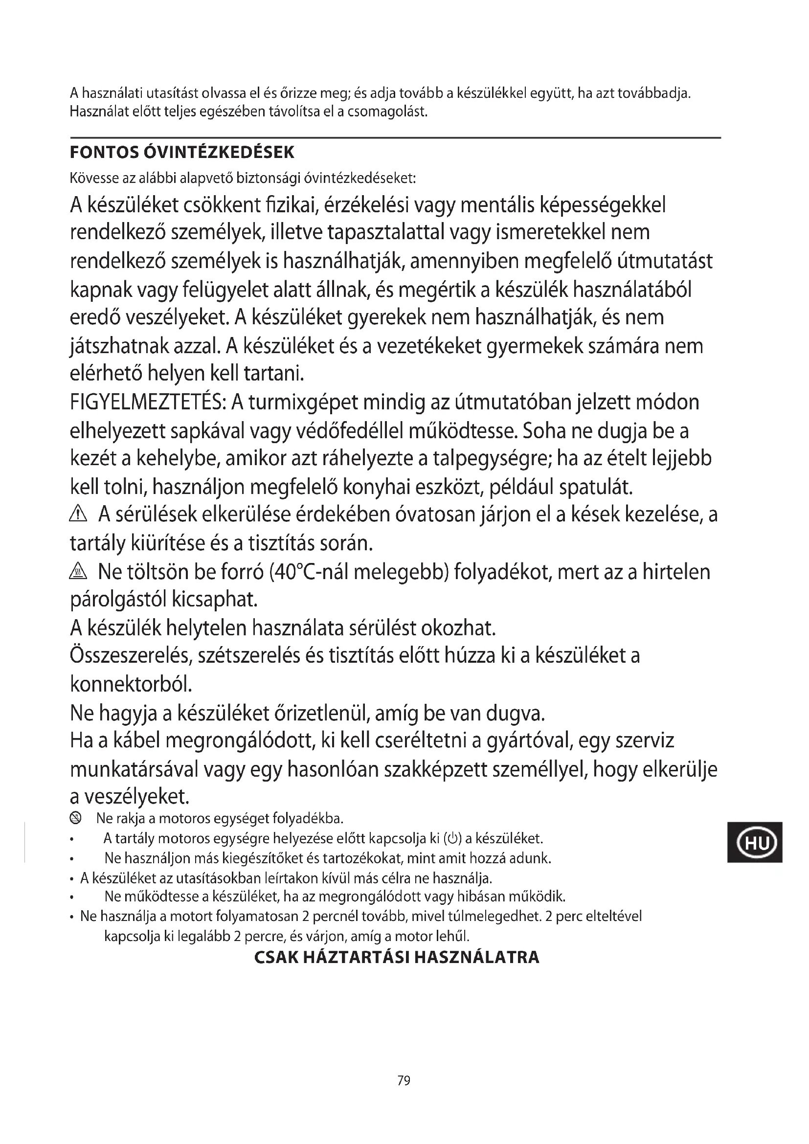 Kövesse az alábbi alapvető biztonsági óvintézkedéseket: A készüléket csökkent zikai, érzékelési vagy mentális képességekkel rendelkező személyek, illetve tapasztalattal vagy ismeretekkel nem rendelkező személyek is használhatják, amennyiben megfelelő útmutatást kapnak vagy felügyelet alatt állnak, és megértik a készülék használatából eredő veszélyeket. A készüléket gyerekek nem használhatják, és nem játszhatnak azzal. A készüléket és a vezetékeket gyermekek számára nem elérhető helyen kell tartani. FIGYELMEZTETÉS: A turmixgépet mindig az útmutatóban jelzett módon elhelyezett sapkával vagy védőfedéllel működtesse. Soha ne dugja be a kezét a kehelybe, amikor azt ráhelyezte a talpegységre; ha az ételt lejjebb kell tolni, használjon megfelelő konyhai eszközt, például spatulát. c A sérülések elkerülése érdekében óvatosan járjon el a kések kezelése, a tartály kiürítése és a tisztítás során. h Ne töltsön be forró (40°C-nál melegebb) folyadékot, mert az a hirtelen párolgástól kicsaphat. A készülék helytelen használata sérülést okozhat. Összeszerelés, szétszerelés és tisztítás előtt húzza ki a készüléket a konnektorból. Ne hagyja a készüléket őrizetlenül, amíg be van dugva. Ha a kábel megrongálódott, ki kell cseréltetni a gyártóval, egy szerviz munkatársával vagy egy hasonlóan szakképzett személlyel, hogy elkerülje a veszélyeket. l Ne rakja a motoros egységet folyadékba.