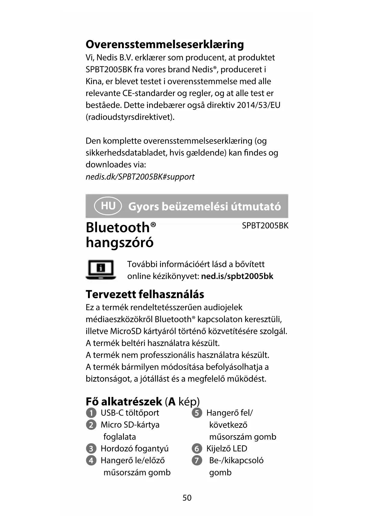 Gyors beüzemelési útmutató Bluetooth® hangszóró SPBT2005BK További információért lásd a bővített online kézikönyvet: ned.is/spbt2005bk Tervezett felhasználás Ez a termék rendeltetésszerűen audiojelek médiaeszközökről Bluetooth® kapcsolaton keresztüli, illetve MicroSD kártyáról történő közvetítésére szolgál. A termék beltéri használatra készült. A termék nem professzionális használatra készült. A termék bármilyen módosítása befolyásolhatja a biztonságot, a jótállást és a megfelelő működést. Fő alkatrészek (A kép) 1 USB-C töltőport 2 Micro SD-kártya foglalata 3 Hordozó fogantyú 4 Hangerő le/előző műsorszám gomb 5 Hangerő fel/ következő műsorszám gomb 6 Kijelző LED 7 Be-/kikapcsoló gomb51 8 Lejátszás/szünet gomb 9 USB – USB-C töltőkábel Biztonsági utasítások