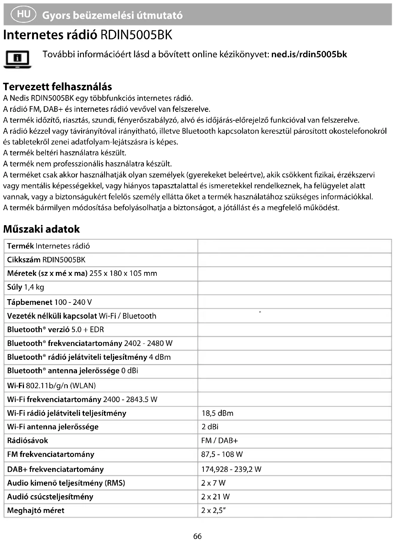 Gyors beüzemelési útmutató Internetes rádió RDIN5005BK További információért lásd a bővített online kézikönyvet: ned.is/rdin5005bk Tervezett felhasználás A Nedis RDIN5005BK egy többfunkciós internetes rádió. A rádió FM, DAB+ és internetes rádió vevővel van felszerelve. A termék időzítő, riasztás, szundi, fényerőszabályzó, alvó és időjárás-előrejelző funkcióval van felszerelve. A rádió kézzel vagy távirányítóval irányítható, illetve Bluetooth kapcsolaton keresztül párosított okostelefonokról és tabletekről zenei adatfolyam-lejátszásra is képes. A termék beltéri használatra készült. A termék nem professzionális használatra készült. A terméket csak akkor használhatják olyan személyek (gyerekeket beleértve), akik csökkent fizikai, érzékszervi vagy mentális képességekkel, vagy hiányos tapasztalattal és ismeretekkel rendelkeznek, ha felügyelet alatt vannak, vagy a biztonságukért felelős személy ellátta őket a termék használatához szükséges információkkal. A termék bármilyen módosítása befolyásolhatja a biztonságot, a jótállást és a megfelelő működést. Műszaki adatok Termék Internetes rádió Cikkszám RDIN5005BK Méretek (sz x mé x ma) 255 x 180 x 105 mm Súly 1,4 kg Tápbemenet 100 - 240 V Vezeték nélküli kapcsolat Wi-Fi / Bluetooth