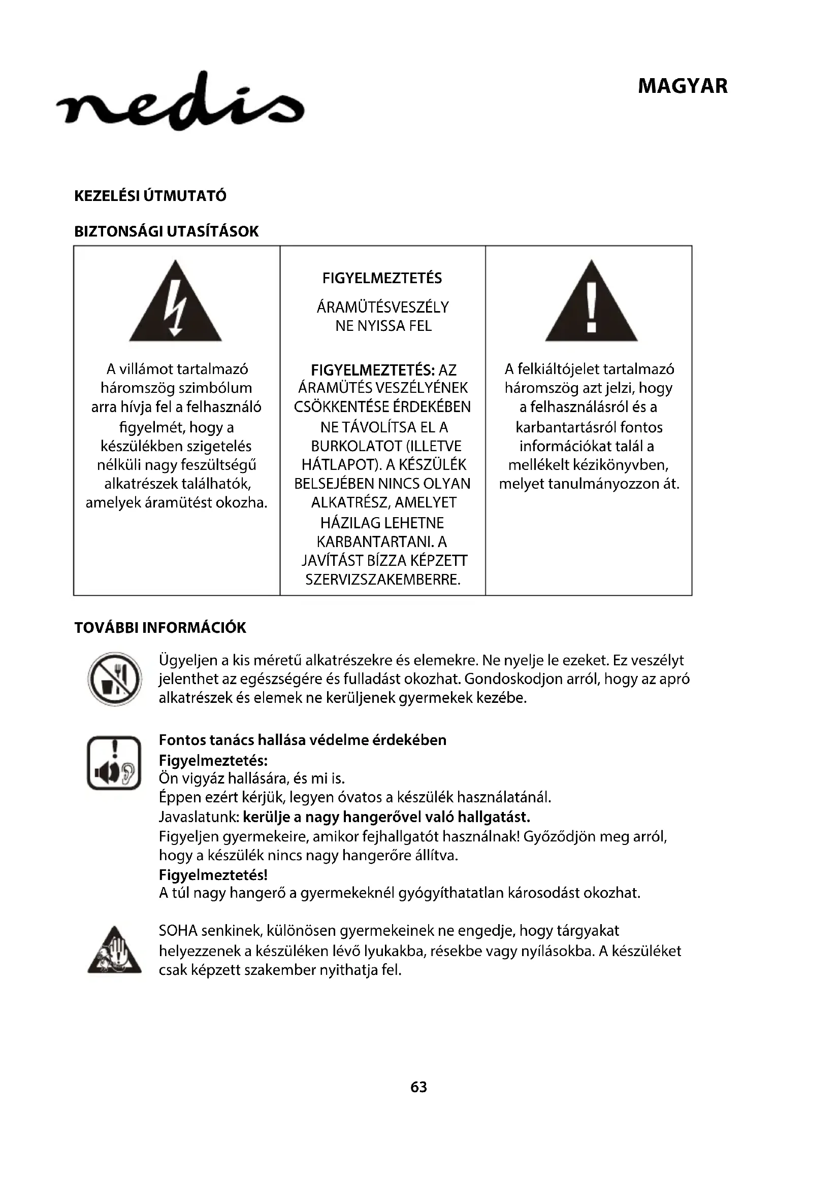 megfelelő tapasztalattal rendelkező személyek (a gyerekeket is beleértve) nem használhatják, kivéve, ha a biztonságukért felelős személy felügyeli őket a készülék használata közben és megtanítja őket annak használatára. A gyerekekre oda kell gyelni, nehogy játsszanak a készülékkel. TOVÁBBI MEGJEGYZÉSEK A KÉSZÜLÉKKEL KAPCSOLATBAN Biztonságos hangerőszint beállítása