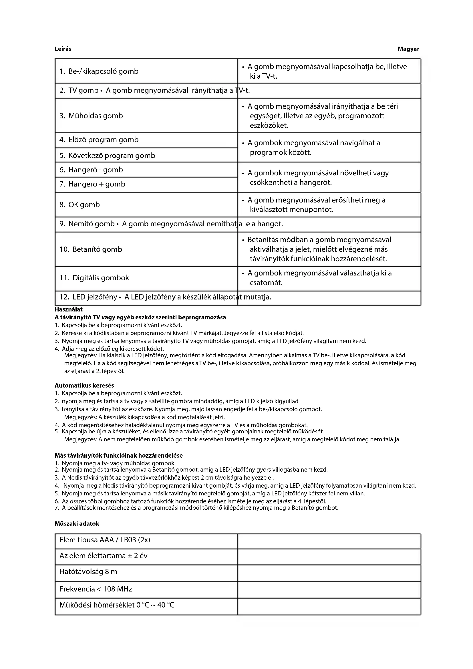 Megjegyzés: Ha kialszik a LED jelzőfény, megtörtént a kód elfogadása. Amennyiben alkalmas a TV be-, illetve kikapcsolására, a kód megfelelő. Ha a kód segítségével nem lehetséges a TV be-, illetve kikapcsolása, próbálkozzon meg egy másik kóddal, és ismételje meg az eljárást a 2. lépéstől. Automatikus keresés
