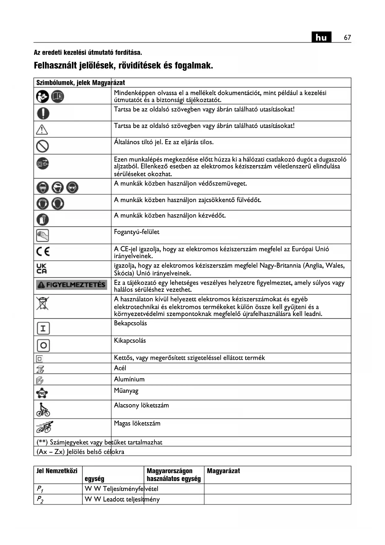 Az eredeti kezelési útmutató fordítása. Felhasznált jelölések, rövidítések és fogalmak. Szimbólumok, jelek Magyarázat Mindenképpen olvassa el a mellékelt dokumentációt, mint például a kezelési útmutatót és a biztonsági tájékoztatót. Tartsa be az oldalsó szövegben vagy ábrán található utasításokat! Tartsa be az oldalsó szövegben vagy ábrán található utasításokat! Általános tiltó jel. Ez az eljárás tilos. Ezen munkalépés megkezdése előtt húzza ki a hálózati csatlakozó dugót a dugaszoló aljzatból. Ellenkező esetben az elektromos kéziszerszám véletlenszerű elindulása sérüléseket okozhat. A munkák közben használjon védőszemüveget. A munkák közben használjon zajcsökkentő fülvédőt. A munkák közben használjon kézvédőt. Fogantyú-felület A CE-jel igazolja, hogy az elektromos kéziszerszám megfelel az Európai Unió irányelveinek. igazolja, hogy az elektromos kéziszerszám megfelel Nagy-Britannia (Anglia, Wales, Skócia) Unió irányelveinek. Ez a tájékozató egy lehetséges veszélyes helyzetre figyelmeztet, amely súlyos vagy halálos sérüléshez vezethet. A használaton kívül helyezett elektromos kéziszerszámokat és egyéb elektrotechnikai és elektromos termékeket külön össze kell gyűjteni és a környezetvédelmi szempontoknak megfelelő újrafelhasználásra kell leadni. Bekapcsolás Kikapcsolás Kettős, vagy megerősített szigeteléssel ellátott termék Acél Alumínium Műanyag Alacsony löketszám Magas löketszám (**) Számjegyeket vagy betűket tartalmazhat (Ax – Zx) Jelölés belső célokra Jel Nemzetközi egység Magyarországon használatos egység Magyarázat