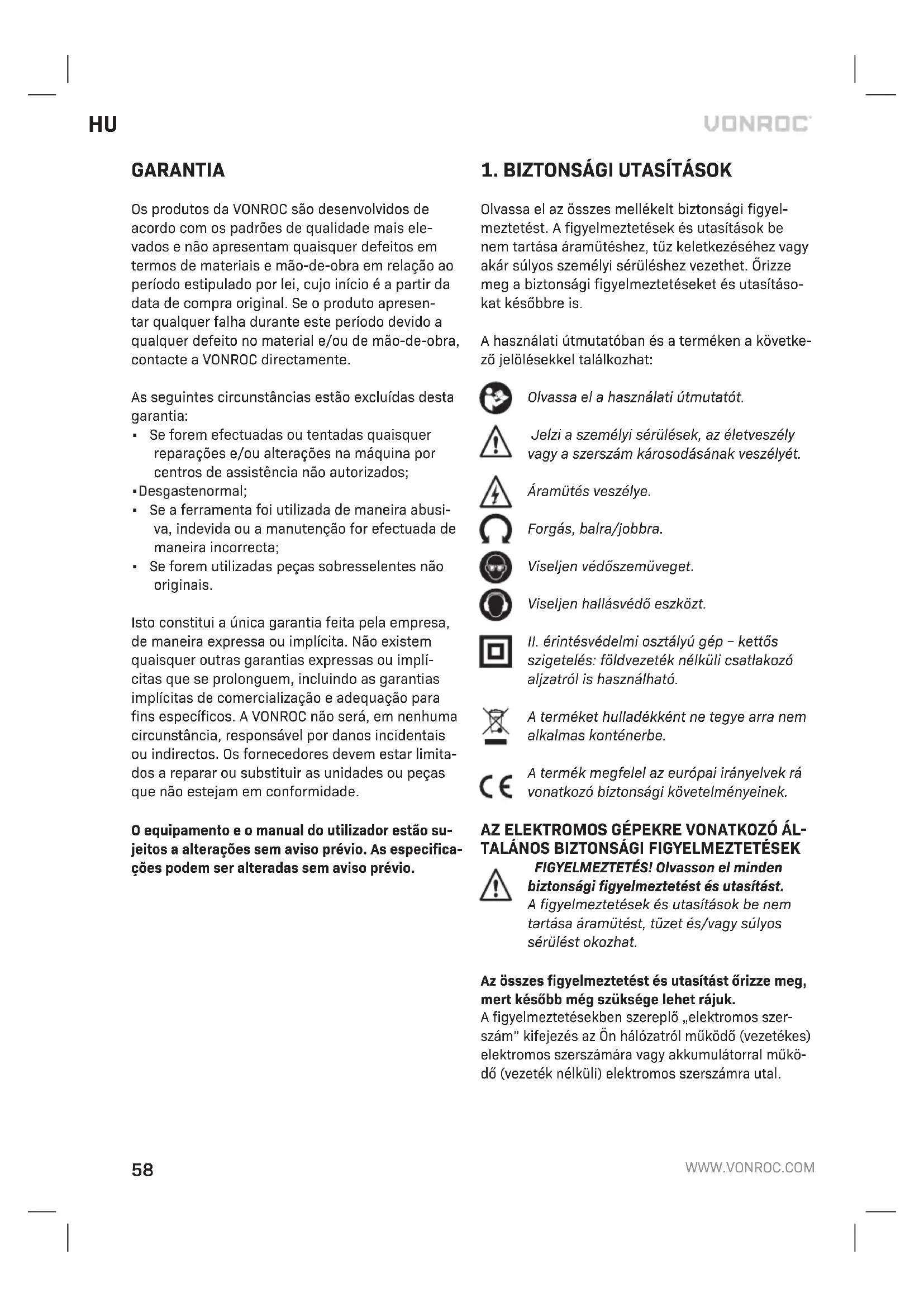 - Nem eredeti pótalkatrészeket használtak. A garancia a vállalat által (akár kifejezetten, akár hallgatólagosan) biztosított kizárólagos garancia. Nem biztosítunk más garanciákat (sem kifejezett, sem beleértett garanciákat, ideértve az értéke- síthetőségre és az adott célra való alkalmasságra vonatkozó hallgatólagos garanciákat is), amelyek a jelen garancia hatókörén túlmutatnak. A VONROC semmilyen esetben sem felelős semmilyen járu- lékos vagy következményes kárért. A forgalmazók jogorvoslati teendői az előírásoknak nem megfelelő egységek vagy alkatrészek javítására és cseréjére korlátozódik. A termék és a használati útmutató változtatásá- nak jogát fenntartjuk. A műszaki adatok előzetes bejelentés nélkül változhatnak.