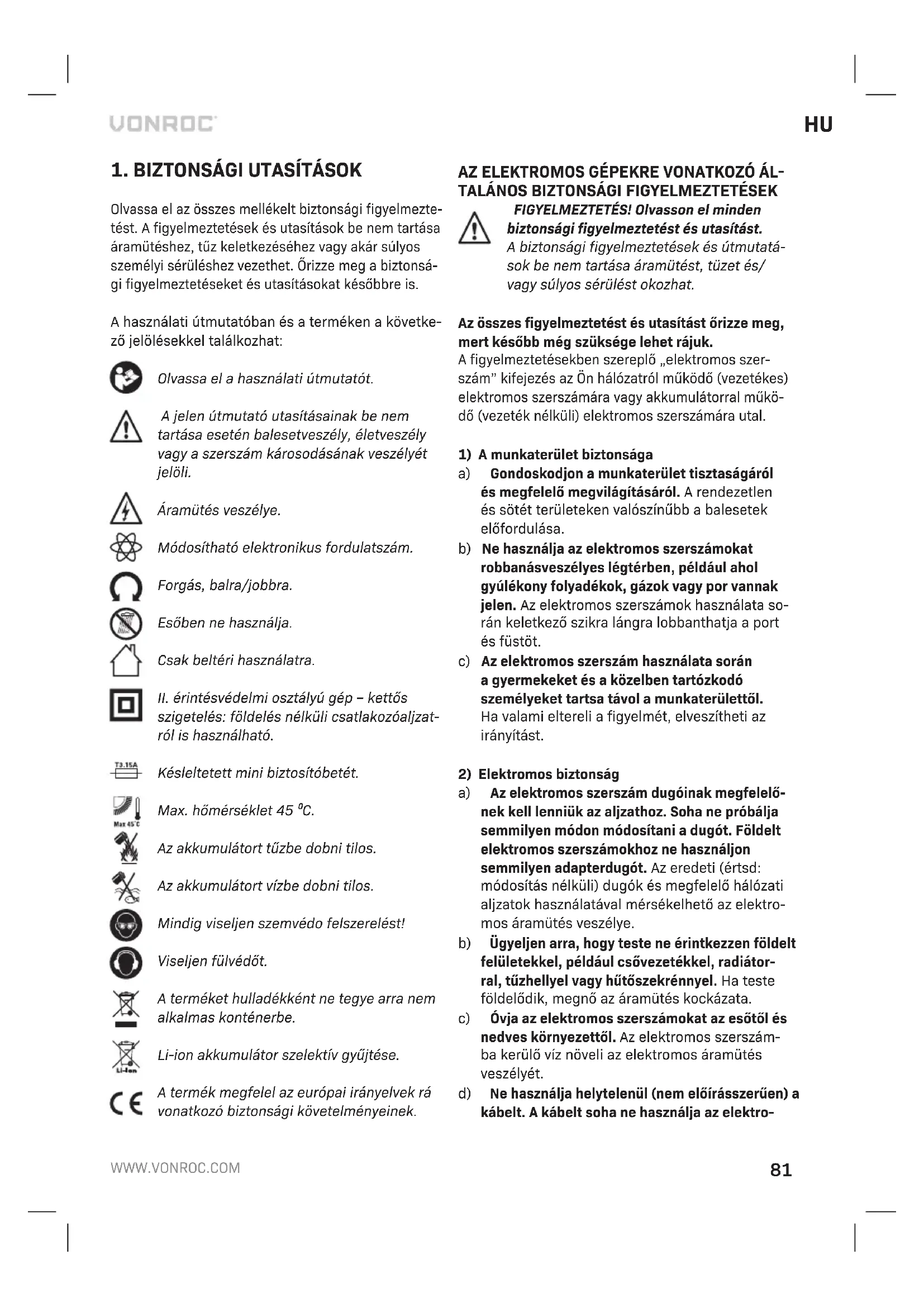 a) Ne nyissa fel az akkumulátort. Rövidzárlat veszélye. b) Hőbehatástól védje az akkumulátort, pl. ne te- gye ki folyamatos erős napsugárzásnak, tűztől, víztől és más nedvességtől is védje. Robbanás- veszély. c) Ha az akkumulátor sérült, vagy rendellenesen használják, gőzök áramolhatnak belőle. Szel- lőztesse át a munkaterületet, és ha egészségi panaszai vannak, kérjen orvosi segítséget. A gőzök irritálhatják a légutakat. d) Az akkumulátort csak a Vonroc termékéhez használja. Ezzel az intézkedéssel veszélyes túlterheléstől védi az akkumulátorát. e) Az akkumulátor megsérülhet, ha a külsejét he- gyes tárggyal (pl. szeggel, csavarhúzóval) vagy erőszakosan manipulálják. Belső rövidzárlat következhet be, amitől az akkumulátor leéghet, füstölhet, robbanhat vagy túlmelegedhet. BIZTONSÁGI FIGYELMEZTETÉSEK A TÖLTŐRE VONATKOZÓAN Rendeltetésszerű használat A töltővel kizárólag CD801AA és CD803AA típusú újratölthető akkumulátorcsomagokat töltsön fel. Másfajta akkumulátorok használata személyi sérü- lést és károkat okozhat. a) A villamos készüléket csökkent fizikai, érzék- szervi vagy szellemi képességű személyek (gyermekeket is ideértve) vagy tapasztalat, ismeret híján csak felügyelet vagy útmutatás mellett használhatják. b) Felügyelje a gyermekeket, nehogy játszhassa- nak a készülékkel. c) Nem újratölthető elemek újratöltésével próbál- kozni tilos! d) Az akkumulátorok töltését jól szellőző helyen kell végezni! Elektromos biztonság Mindig ellenőrizze, hogy a tápellátás megfe- lel-e az adattáblán feltüntetett feszültség- nek.