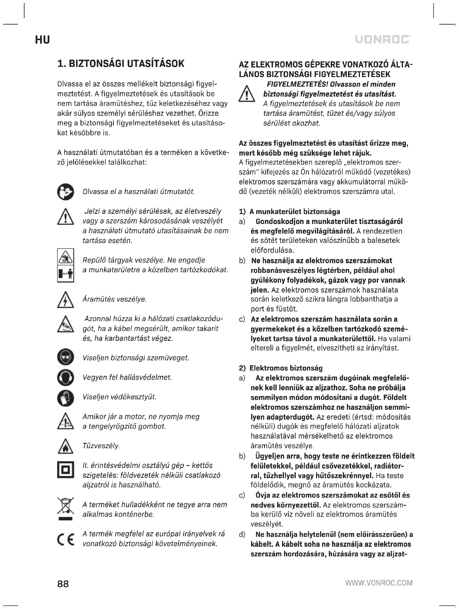 - Nem eredeti pótalkatrészeket használtak. A garancia a vállalat által (akár kifejezetten, akár hallgatólagosan) biztosított kizárólagos garancia. Nem biztosítunk más garanciákat (sem kifejezett, sem beleértett garanciákat, ideértve az értéke- síthetőségre és az adott célra való alkalmasságra vonatkozó hallgatólagos garanciákat is), amelyek a jelen garancia hatókörén túlmutatnak. A VONROC semmilyen esetben sem felelős semmilyen járu- lékos vagy következményes kárért. A forgalmazók jogorvoslati teendői az előírásoknak nem megfelelő egységek vagy alkatrészek javítására és cseréjére korlátozódik. A termék és a használati útmutató változtatásá- nak jogát fenntartjuk. A műszaki adatok előzetes bejelentés nélkül változhatnak.