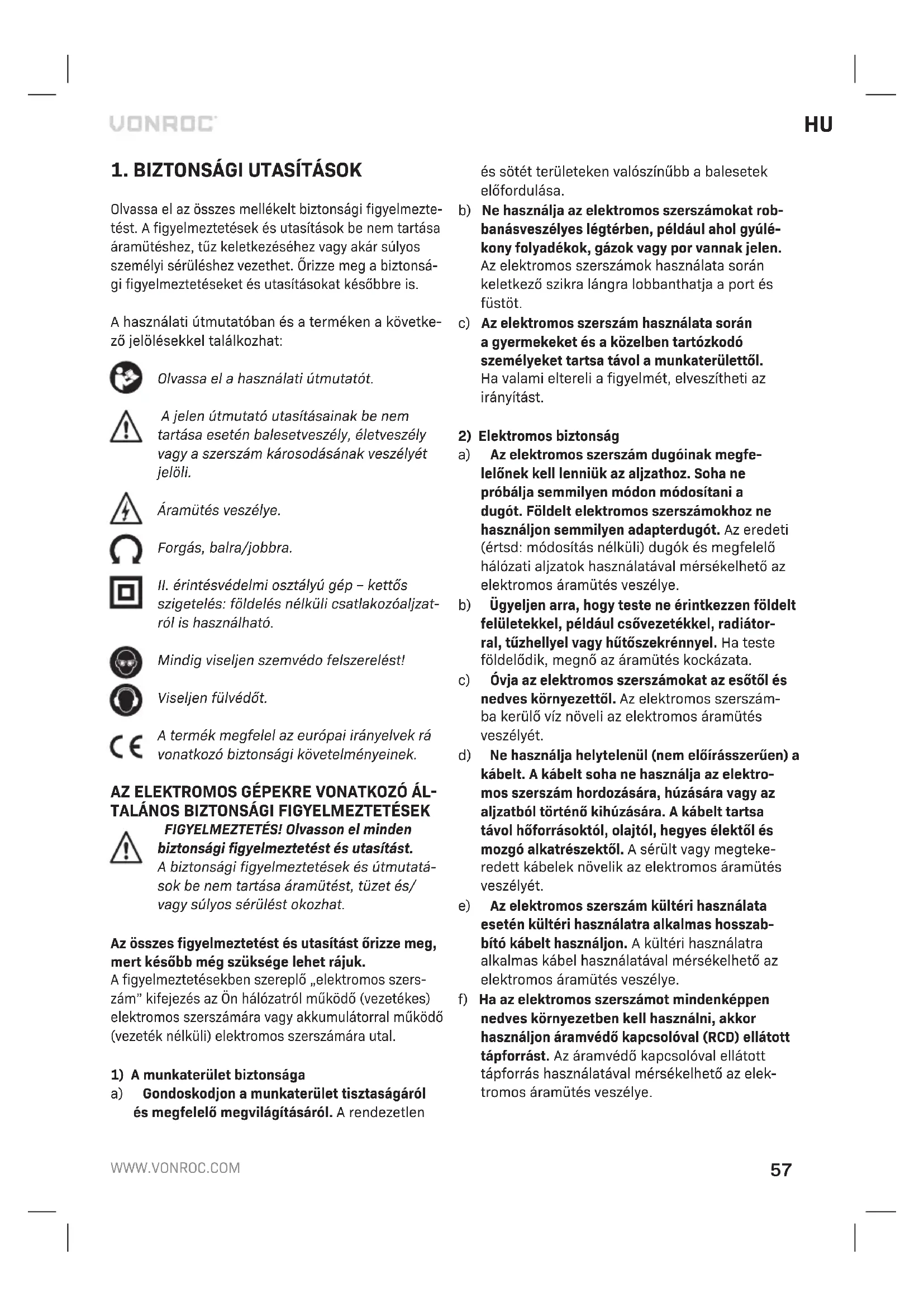A VONROC termékei a legmagasabb minőségi normák szerint készülnek, és az eredeti vásárlás napjától szá- mított, törvényileg előírt időtartamig garantáljuk, hogy anyag- és gyártási hibáktól mentesen fognak működ- ni. Ha a terméken ezen időszak alatt bármilyen hiba jelentkezik anyag- és/vagy gyártási hiba miatt, kérjük, forduljon közvetlenül a VONROC kapcsolattartójához. A szavatosság nem érvényes a következő körülmé- nyek egyikére sem: