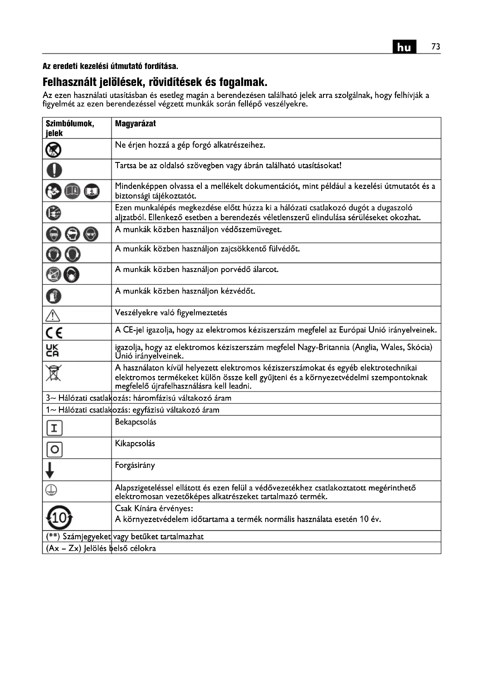 Az eredeti kezelési útmutató fordítása. Felhasznált jelölések, rövidítések és fogalmak. Az ezen használati utasításban és esetleg magán a berendezésen található jelek arra szolgálnak, hogy felhívják a figyelmét az ezen berendezéssel végzett munkák során fellépő veszélyekre. Szimbólumok, jelek Magyarázat Ne érjen hozzá a gép forgó alkatrészeihez. Tartsa be az oldalsó szövegben vagy ábrán található utasításokat! Mindenképpen olvassa el a mellékelt dokumentációt, mint például a kezelési útmutatót és a biztonsági tájékoztatót. Ezen munkalépés megkezdése előtt húzza ki a hálózati csatlakozó dugót a dugaszoló aljzatból. Ellenkező esetben a berendezés véletlenszerű elindulása sérüléseket okozhat. A munkák közben használjon védőszemüveget. A munkák közben használjon zajcsökkentő fülvédőt. A munkák közben használjon porvédő álarcot. A munkák közben használjon kézvédőt. Veszélyekre való figyelmeztetés A CE-jel igazolja, hogy az elektromos kéziszerszám megfelel az Európai Unió irányelveinek. igazolja, hogy az elektromos kéziszerszám megfelel Nagy-Britannia (Anglia, Wales, Skócia) Unió irányelveinek. A használaton kívül helyezett elektromos kéziszerszámokat és egyéb elektrotechnikai elektromos termékeket külön össze kell gyűjteni és a környezetvédelmi szempontoknak megfelelő újrafelhasználásra kell leadni. 3~ Hálózati csatlakozás: háromfázisú váltakozó áram 1~ Hálózati csatlakozás: egyfázisú váltakozó áram Bekapcsolás Kikapcsolás Forgásirány Alapszigeteléssel ellátott és ezen felül a védővezetékhez csatlakoztatott megérinthető elektromosan vezetőképes alkatrészeket tartalmazó termék. Csak Kínára érvényes: A környezetvédelem időtartama a termék normális használata esetén 10 év. (**) Számjegyeket vagy betűket tartalmazhat (Ax – Zx) Jelölés belső célokra74