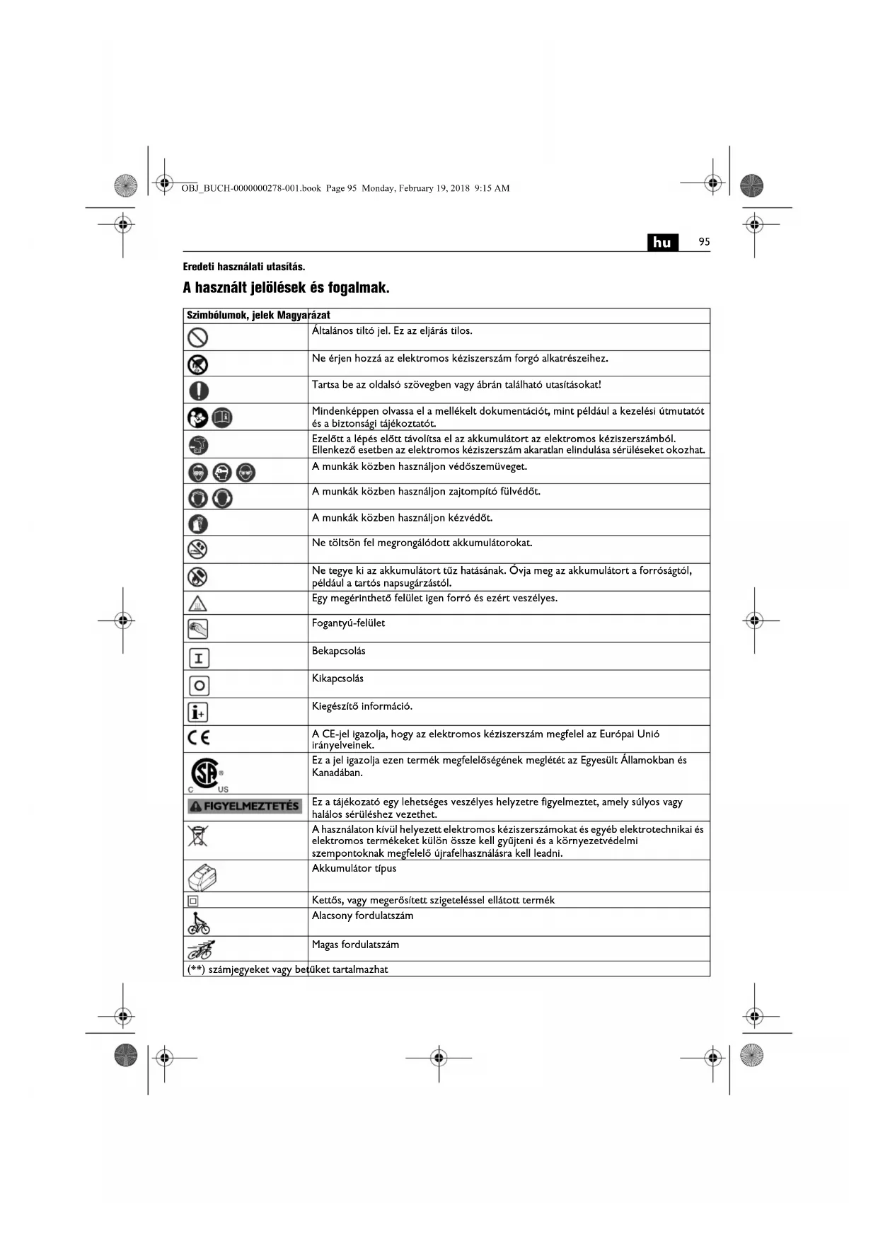 Eredeti használati utasítás. A használt jelölések és fogalmak. Szimbólumok, jelek Magyarázat Általános tiltó jel. Ez az eljárás tilos. Ne érjen hozzá az elektromos kéziszerszám forgó alkatrészeihez. Tartsa be az oldalsó szövegben vagy ábrán található utasításokat! Mindenképpen olvassa el a mellékelt dokumentációt, mint például a kezelési útmutatót és a biztonsági tájékoztatót. Ezelőtt a lépés előtt távolítsa el az akkumulátort az elektromos kéziszerszámból. Ellenkező esetben az elektromos kéziszerszám akaratlan elindulása sérüléseket okozhat. A munkák közben használjon védőszemüveget. A munkák közben használjon zajtompító fülvédőt. A munkák közben használjon kézvédőt. Ne töltsön fel megrongálódott akkumulátorokat. Ne tegye ki az akkumulátort tűz hatásának. Óvja meg az akkumulátort a forróságtól, például a tartós napsugárzástól. Egy megérinthető felület igen forró és ezért veszélyes. Fogantyú-felület Bekapcsolás Kikapcsolás Kiegészítő információ. A CE-jel igazolja, hogy az elektromos kéziszerszám megfelel az Európai Unió irányelveinek. Ez a jel igazolja ezen termék megfelelőségének meglétét az Egyesült Államokban és Kanadában. Ez a tájékozató egy lehetséges veszélyes helyzetre figyelmeztet, amely súlyos vagy halálos sérüléshez vezethet. A használaton kívül helyezett elektromos kéziszerszámokat és egyéb elektrotechnikai és elektromos termékeket külön össze kell gyűjteni és a környezetvédelmi szempontoknak megfelelő újrafelhasználásra kell leadni. Akkumulátor típus Kettős, vagy megerősített szigeteléssel ellátott termék Alacsony fordulatszám Magas fordulatszám (**) számjegyeket vagy betűket tartalmazhat OBJ_BUCH-0000000278-001.book Page 95 Monday, February 19, 2018 9:15 AM96
