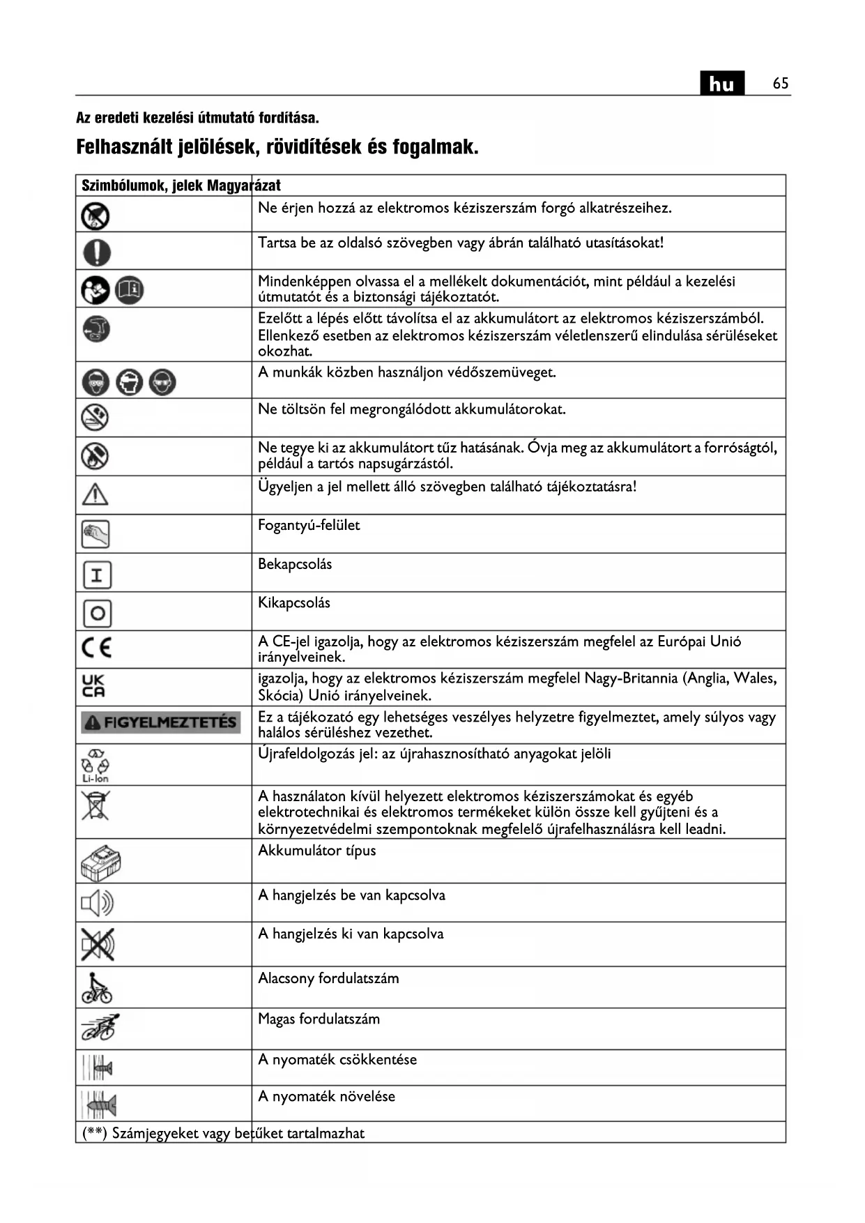 Az eredeti kezelési útmutató fordítása. Felhasznált jelölések, rövidítések és fogalmak. Szimbólumok, jelek Magyarázat Ne érjen hozzá az elektromos kéziszerszám forgó alkatrészeihez. Tartsa be az oldalsó szövegben vagy ábrán található utasításokat! Mindenképpen olvassa el a mellékelt dokumentációt, mint például a kezelési útmutatót és a biztonsági tájékoztatót. Ezelőtt a lépés előtt távolítsa el az akkumulátort az elektromos kéziszerszámból. Ellenkező esetben az elektromos kéziszerszám véletlenszerű elindulása sérüléseket okozhat. A munkák közben használjon védőszemüveget. Ne töltsön fel megrongálódott akkumulátorokat. Ne tegye ki az akkumulátort tűz hatásának. Óvja meg az akkumulátort a forróságtól, például a tartós napsugárzástól. Ügyeljen a jel mellett álló szövegben található tájékoztatásra! Fogantyú-felület Bekapcsolás Kikapcsolás A CE-jel igazolja, hogy az elektromos kéziszerszám megfelel az Európai Unió irányelveinek. igazolja, hogy az elektromos kéziszerszám megfelel Nagy-Britannia (Anglia, Wales, Skócia) Unió irányelveinek. Ez a tájékozató egy lehetséges veszélyes helyzetre figyelmeztet, amely súlyos vagy halálos sérüléshez vezethet. Újrafeldolgozás jel: az újrahasznosítható anyagokat jelöli A használaton kívül helyezett elektromos kéziszerszámokat és egyéb elektrotechnikai és elektromos termékeket külön össze kell gyűjteni és a környezetvédelmi szempontoknak megfelelő újrafelhasználásra kell leadni. Akkumulátor típus A hangjelzés be van kapcsolva A hangjelzés ki van kapcsolva Alacsony fordulatszám Magas fordulatszám A nyomaték csökkentése A nyomaték növelése (**) Számjegyeket vagy betűket tartalmazhat66