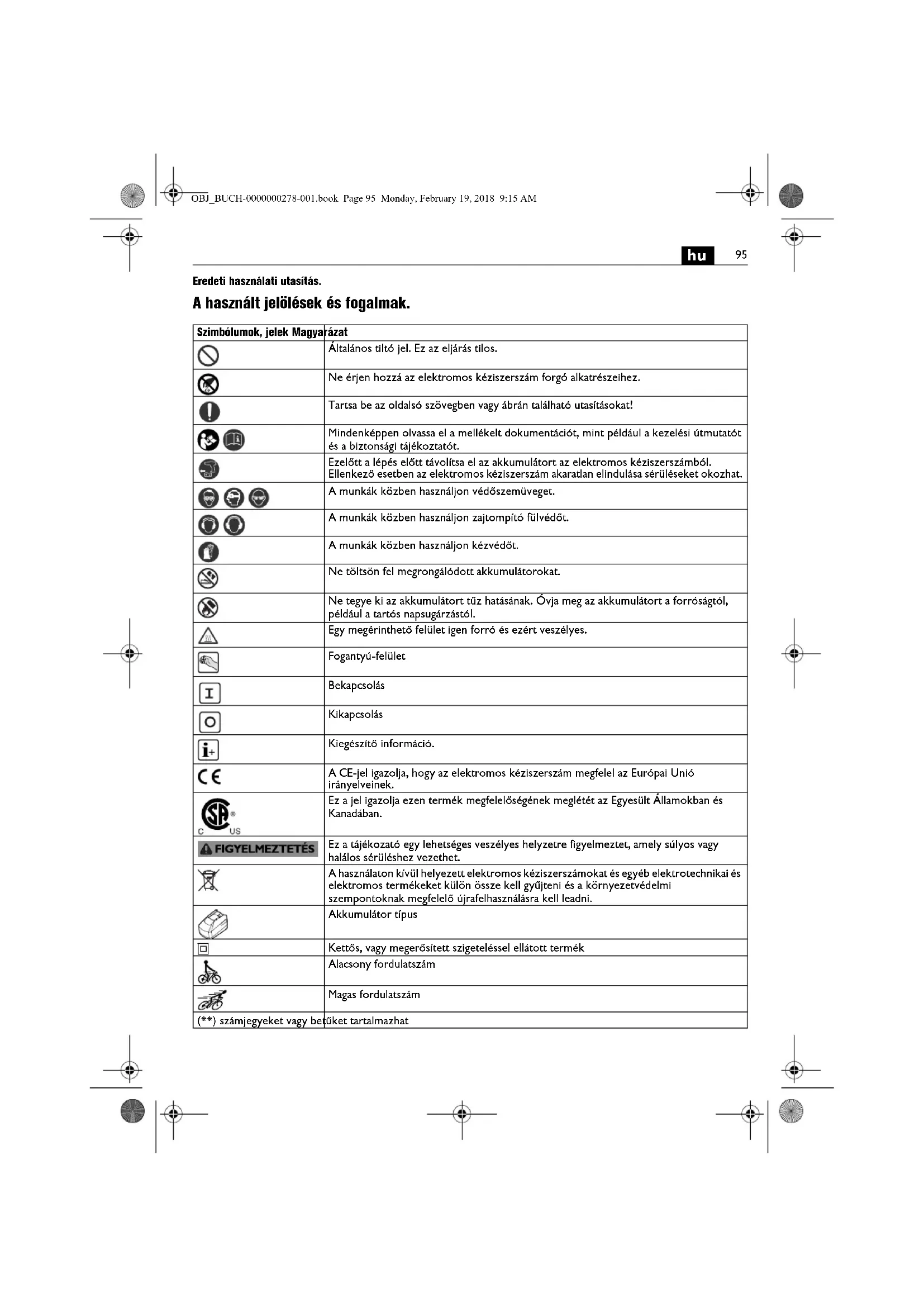 Eredeti használati utasítás. A használt jelölések és fogalmak. Szimbólumok, jelek Magyarázat Általános tiltó jel. Ez az eljárás tilos. Ne érjen hozzá az elektromos kéziszerszám forgó alkatrészeihez. Tartsa be az oldalsó szövegben vagy ábrán található utasításokat! Mindenképpen olvassa el a mellékelt dokumentációt, mint például a kezelési útmutatót és a biztonsági tájékoztatót. Ezelőtt a lépés előtt távolítsa el az akkumulátort az elektromos kéziszerszámból. Ellenkező esetben az elektromos kéziszerszám akaratlan elindulása sérüléseket okozhat. A munkák közben használjon védőszemüveget. A munkák közben használjon zajtompító fülvédőt. A munkák közben használjon kézvédőt. Ne töltsön fel megrongálódott akkumulátorokat. Ne tegye ki az akkumulátort tűz hatásának. Óvja meg az akkumulátort a forróságtól, például a tartós napsugárzástól. Egy megérinthető felület igen forró és ezért veszélyes. Fogantyú-felület Bekapcsolás Kikapcsolás Kiegészítő információ. A CE-jel igazolja, hogy az elektromos kéziszerszám megfelel az Európai Unió irányelveinek. Ez a jel igazolja ezen termék megfelelőségének meglétét az Egyesült Államokban és Kanadában. Ez a tájékozató egy lehetséges veszélyes helyzetre figyelmeztet, amely súlyos vagy halálos sérüléshez vezethet. A használaton kívül helyezett elektromos kéziszerszámokat és egyéb elektrotechnikai és elektromos termékeket külön össze kell gyűjteni és a környezetvédelmi szempontoknak megfelelő újrafelhasználásra kell leadni. Akkumulátor típus Kettős, vagy megerősített szigeteléssel ellátott termék Alacsony fordulatszám Magas fordulatszám (**) számjegyeket vagy betűket tartalmazhat OBJ_BUCH-0000000278-001.book Page 95 Monday, February 19, 2018 9:15 AM96