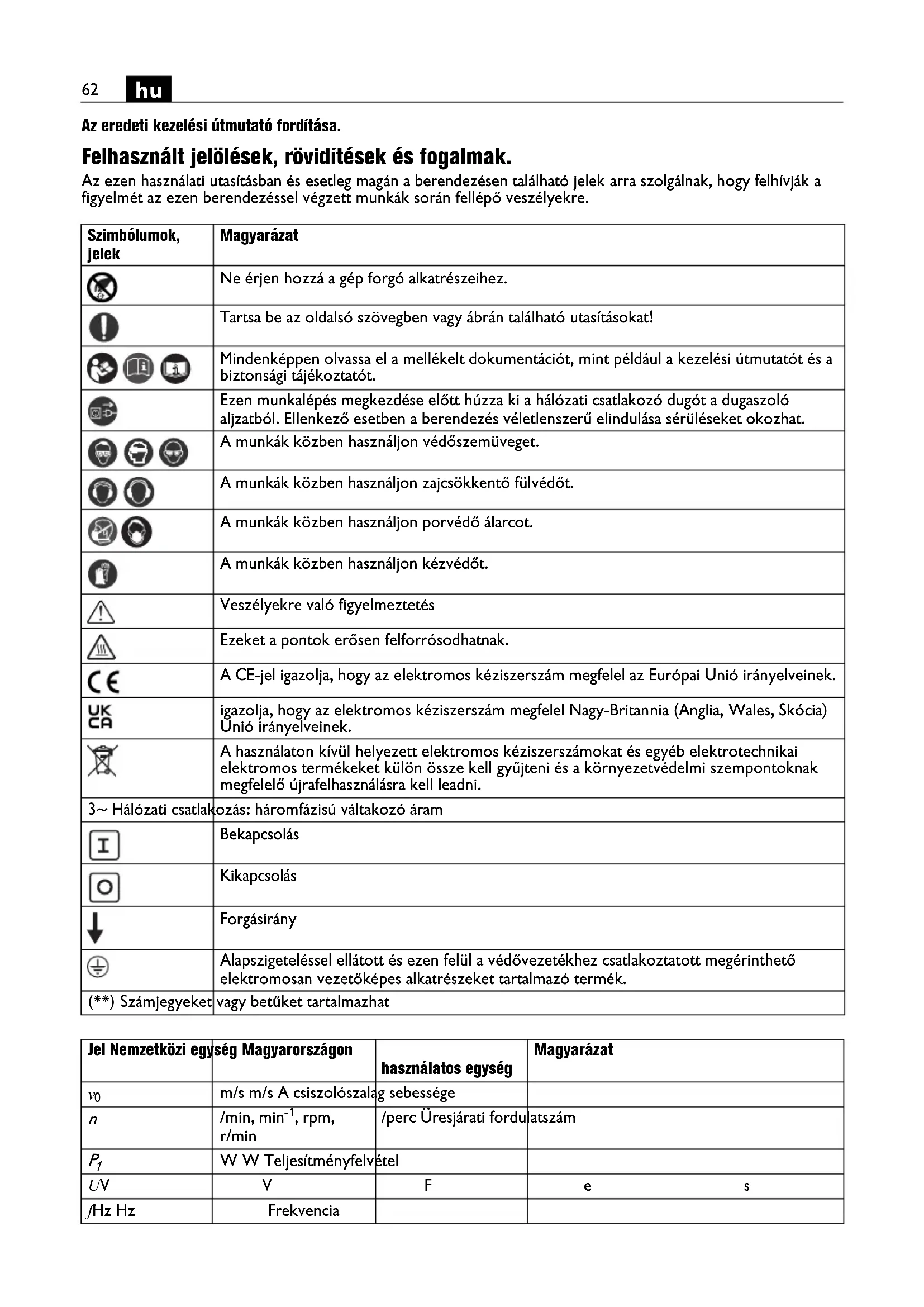 Az eredeti kezelési útmutató fordítása. Felhasznált jelölések, rövidítések és fogalmak. Az ezen használati utasításban és esetleg magán a berendezésen található jelek arra szolgálnak, hogy felhívják a figyelmét az ezen berendezéssel végzett munkák során fellépő veszélyekre. Szimbólumok, jelek Magyarázat Ne érjen hozzá a gép forgó alkatrészeihez. Tartsa be az oldalsó szövegben vagy ábrán található utasításokat! Mindenképpen olvassa el a mellékelt dokumentációt, mint például a kezelési útmutatót és a biztonsági tájékoztatót. Ezen munkalépés megkezdése előtt húzza ki a hálózati csatlakozó dugót a dugaszoló aljzatból. Ellenkező esetben a berendezés véletlenszerű elindulása sérüléseket okozhat. A munkák közben használjon védőszemüveget. A munkák közben használjon zajcsökkentő fülvédőt. A munkák közben használjon porvédő álarcot. A munkák közben használjon kézvédőt. Veszélyekre való figyelmeztetés Ezeket a pontok erősen felforrósodhatnak. A CE-jel igazolja, hogy az elektromos kéziszerszám megfelel az Európai Unió irányelveinek. igazolja, hogy az elektromos kéziszerszám megfelel Nagy-Britannia (Anglia, Wales, Skócia) Unió irányelveinek. A használaton kívül helyezett elektromos kéziszerszámokat és egyéb elektrotechnikai elektromos termékeket külön össze kell gyűjteni és a környezetvédelmi szempontoknak megfelelő újrafelhasználásra kell leadni. 3~ Hálózati csatlakozás: háromfázisú váltakozó áram Bekapcsolás Kikapcsolás Forgásirány Alapszigeteléssel ellátott és ezen felül a védővezetékhez csatlakoztatott megérinthető elektromosan vezetőképes alkatrészeket tartalmazó termék. (**) Számjegyeket vagy betűket tartalmazhat Jel Nemzetközi egység Magyarországon használatos egység Magyarázat