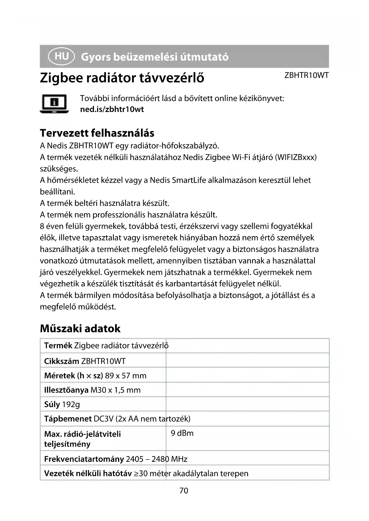 Gyors beüzemelési útmutató Zigbee radiátor távvezérlő ZBHTR10WT További információért lásd a bővített online kézikönyvet: ned.is/zbhtr10wt Tervezett felhasználás A Nedis ZBHTR10WT egy radiátor-hőfokszabályzó. A termék vezeték nélküli használatához Nedis Zigbee Wi-Fi átjáró (WIFIZBxxx) szükséges. A hőmérsékletet kézzel vagy a Nedis SmartLife alkalmazáson keresztül lehet beállítani. A termék beltéri használatra készült. A termék nem professzionális használatra készült. 8 éven felüli gyermekek, továbbá testi, érzékszervi vagy szellemi fogyatékkal élők, illetve tapasztalat vagy ismeretek hiányában hozzá nem értő személyek használhatják a terméket megfelelő felügyelet vagy a biztonságos használatra vonatkozó útmutatások mellett, amennyiben tisztában vannak a használattal járó veszélyekkel. Gyermekek nem játszhatnak a termékkel. Gyermekek nem végezhetik a készülék tisztítását és karbantartását felügyelet nélkül. A termék bármilyen módosítása befolyásolhatja a biztonságot, a jótállást és a megfelelő működést. Műszaki adatok Termék Zigbee radiátor távvezérlő Cikkszám ZBHTR10WT Méretek (h × sz) 89 x 57 mm Illesztőanya M30 x 1,5 mm Súly 192g Tápbemenet DC3V (2x AA nem tartozék) Max. rádió-jelátviteli teljesítmény 9 dBm Frekvenciatartomány 2405 – 2480 MHz Vezeték nélküli hatótáv ≥30 méter akadálytalan terepen71 Hőmérséklet-beállítási tartomány Automatikus üzemmód Kézi üzemmód Fagyásgátló üzemmód 5 °C ~ 30 °C 5 °C ~ 30 °C 5 °C ~ 15 °C Mérési tartomány 0 °C ~ 50 °C Mérési időközök 2 perc Szeleplöket Legfeljebb 6 mm Hangszint <35 dBa Környezeti hőmérséklet -20 °C ~ 65 °C Tárolási hőmérséklet 0 °C ~ 40 °C Legmagasabb vízhőmérséklet 90 °C Környezetvédelmi normák RoHS Fő alkatrészek (A kép) 1 Gyűrű alakú anyacsavar 2 Test 3 Hőfokszabályzó tárcsa 4 LCD kijelző 5 Hiba 6 Alacsony akkumulátorfeszültség 7 Hőmérséklet beállítása 8 Ablaknyitás-érzékelő 9 Automatikus üzemmód q Gyermekzár w Hálózati állapotjelző e Telepítési üzemmód r Kézi üzemmód Alkalmazás áttekintése(B ábra) 1 Elemek állapota 2 Hőmérséklet beállítása 3 Szoba hőmérséklete 4 Kézi üzemmód 5 Automatikus üzemmód 6 Gyermekzár 7 Szelepérzékelő 8 Hőfokállító tárcsa 9 Hőmérséklet-tartomány q Fagyásgátló üzemmód w Ablaknyitás-érzékelő Biztonsági utasítások