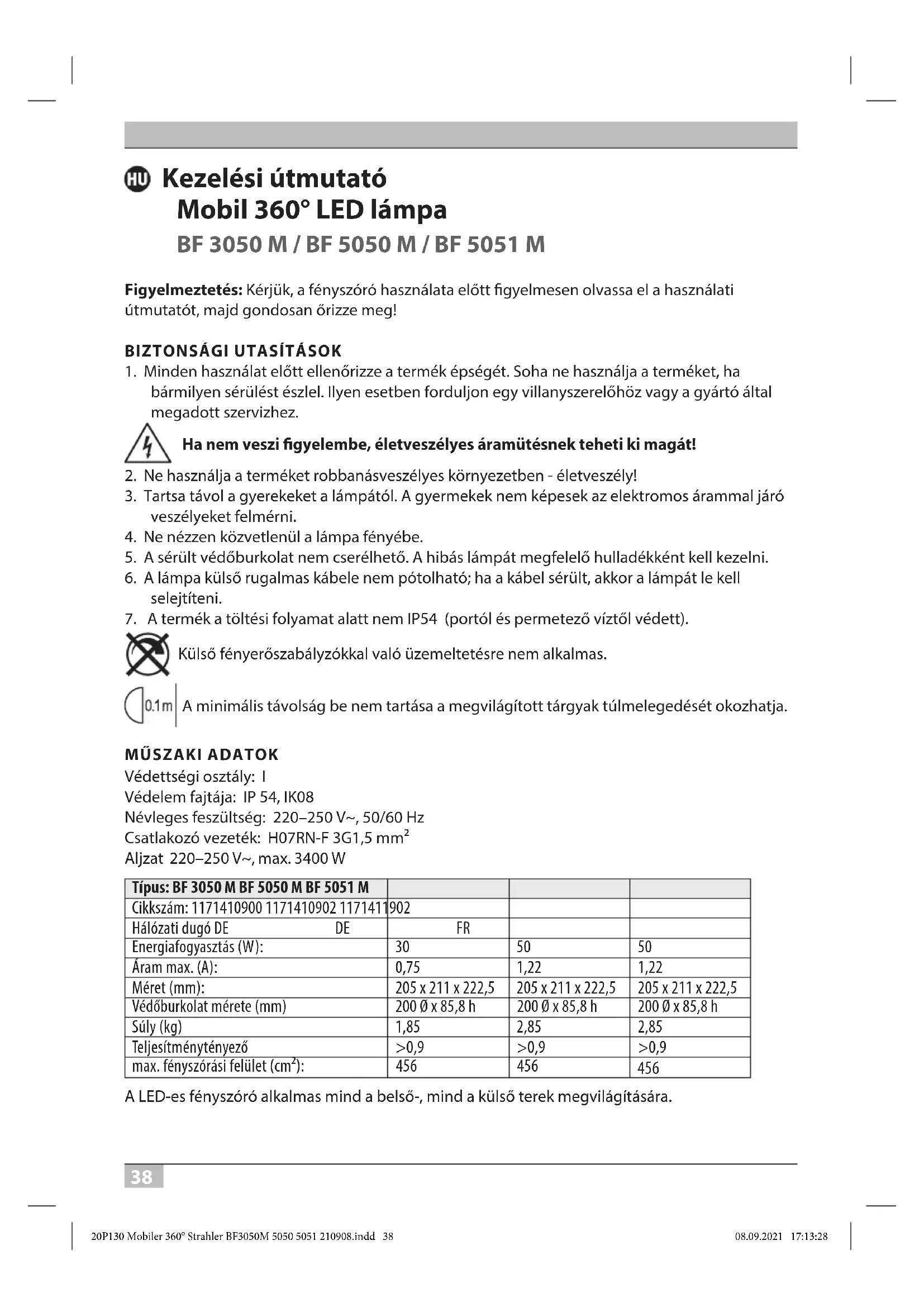 Zářič před čištěním odpojte od přívodu elektrického proudu. Nepoužívejte žádná rozpouštědla, dráždivé nebo podobné čisticí prostředky. Používejte k čištění pouze suchý nebo lehce navlhčený hadřík. LIKVIDACE Ekologicky zlikvidujte elektrické přístroje! Elektrické spotřebiče nepatří k domovnímu odpadu! Podle Evropské směrnice 2012/19/EU o elektrických a elektronických starých přístrojích se musí opotřebené elektrospotřebiče shromáždit zvlášť a odvést k ekologicky nezávadné recyklaci. O možnostech likvidace vysloužilých přístrojů se můžete informovat u svého obecního nebo městského úřadu. PROHLÁŠENÍ O SHODĚ S NORMAMI EU EU prohlášeni o shod je uloženo u výrobce. VÝROBCE Hugo Brennenstuhl GmbH & Co. KG Seestraße 1 – 3 · D-72074 Tübingen H. Brennenstuhl S.A.S. 4 rue de Bruxelles ∙ F-67170 Bernolsheim lectra technik ag Blegistrasse 13 · CH-6340 Baar Pro další informace vám doporučujeme oblast Servis/FAQ na naší internetové stránce www.brennenstuhl.com. 20P130 Mobiler 360° Strahler BF3050M 5050 5051 210908.indd 3720P130 Mobiler 360° Strahler BF3050M 5050 5051 210908.indd 37 08.09.2021 17:13:2808.09.2021 17:13:2838 Kezelési útmutató Mobil 360° LED lámpa BF 3050 M / BF 5050 M / BF 5051 M Figyelmeztetés: Kérjük, a fényszóró használata előtt gyelmesen olvassa el a használati útmutatót, majd gondosan őrizze meg!BIZTONSÁGI UTASÍTÁSOK1. Minden használat előtt ellenőrizze a termék épségét. Soha ne használja a terméket, ha bármilyen sérülést észlel. Ilyen esetben forduljon egy villanyszerelőhöz vagy a gyártó által megadott szervizhez. Ha nem veszi gyelembe, életveszélyes áramütésnek teheti ki magát!2. Ne használja a terméket robbanásveszélyes környezetben - életveszély!3. Tartsa távol a gyerekeket a lámpától. A gyermekek nem képesek az elektromos árammal járó veszélyeket felmérni.4. Ne nézzen közvetlenül a lámpa fényébe.5. A sérült védőburkolat nem cserélhető. A hibás lámpát megfelelő hulladékként kell kezelni.6. A lámpa külső rugalmas kábele nem pótolható; ha a kábel sérült, akkor a lámpát le kell selejtíteni.7. A termék a töltési folyamat alatt nem IP54 (portól és permetező víztől védett). Külső fényerőszabályzókkal való üzemeltetésre nem alkalmas. A minimális távolság be nem tartása a megvilágított tárgyak túlmelegedését okozhatja.MŰSZAKI ADATOKVédettségi osztály: IVédelem fajtája: IP 54, IK08Névleges feszültség: 220–250 V~, 50/60 Hz Csatlakozó vezeték: H07RN-F 3G1,5 mm² Aljzat 220–250 V~, max. 3400 W Típus: BF 3050 M BF 5050 M BF 5051 M Cikkszám: 1171410900 1171410902 1171411902 Hálózati dugó DE DE FR Energiafogyasztás (W): 30 50 50 Áram max. (A): 0,75 1,22 1,22 Méret (mm): 205 x 211 x 222,5 205 x 211 x 222,5 205 x 211 x 222,5 Védőburkolat mérete (mm) 200 Ø x 85,8 h 200 Ø x 85,8 h 200 Ø x 85,8 h Súly (kg) 1,85 2,85 2,85 Teljesítménytényező >0,9 >0,9 >0,9 max. fényszórási felület (cm²): 456 456