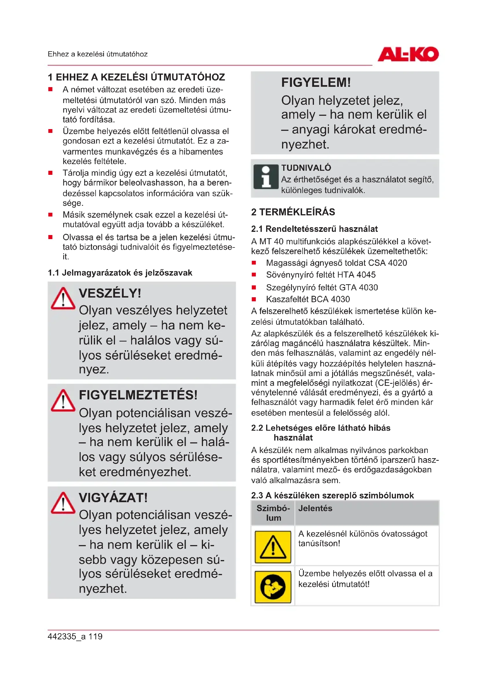 HASZNÁLATI ÚTMUTATÓ MT 40 AL-KO