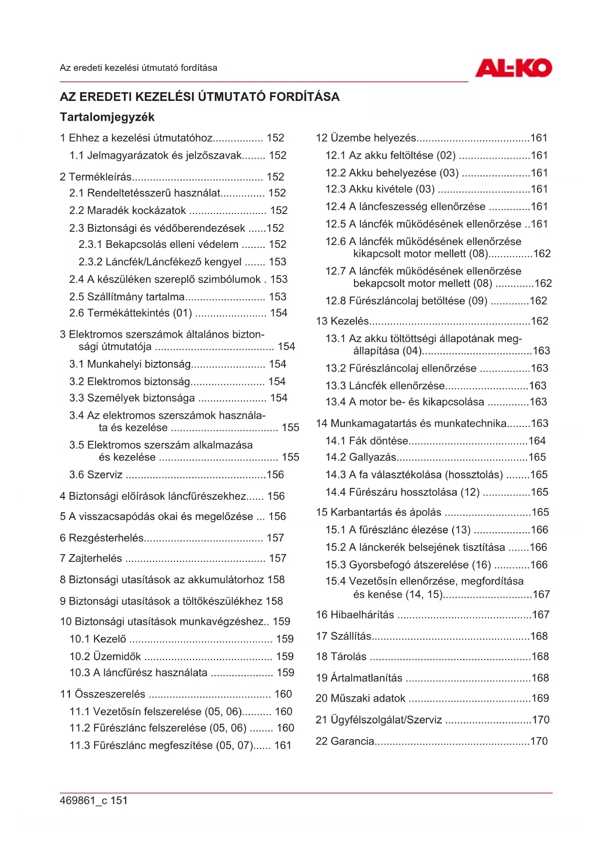 - 8 Biztonsági utasítások az akkumulátorhoz 158 9 Biztonsági utasítások a töltőkészülékhez 158 10 Biztonsági utasítások munkavégzéshez p. 159