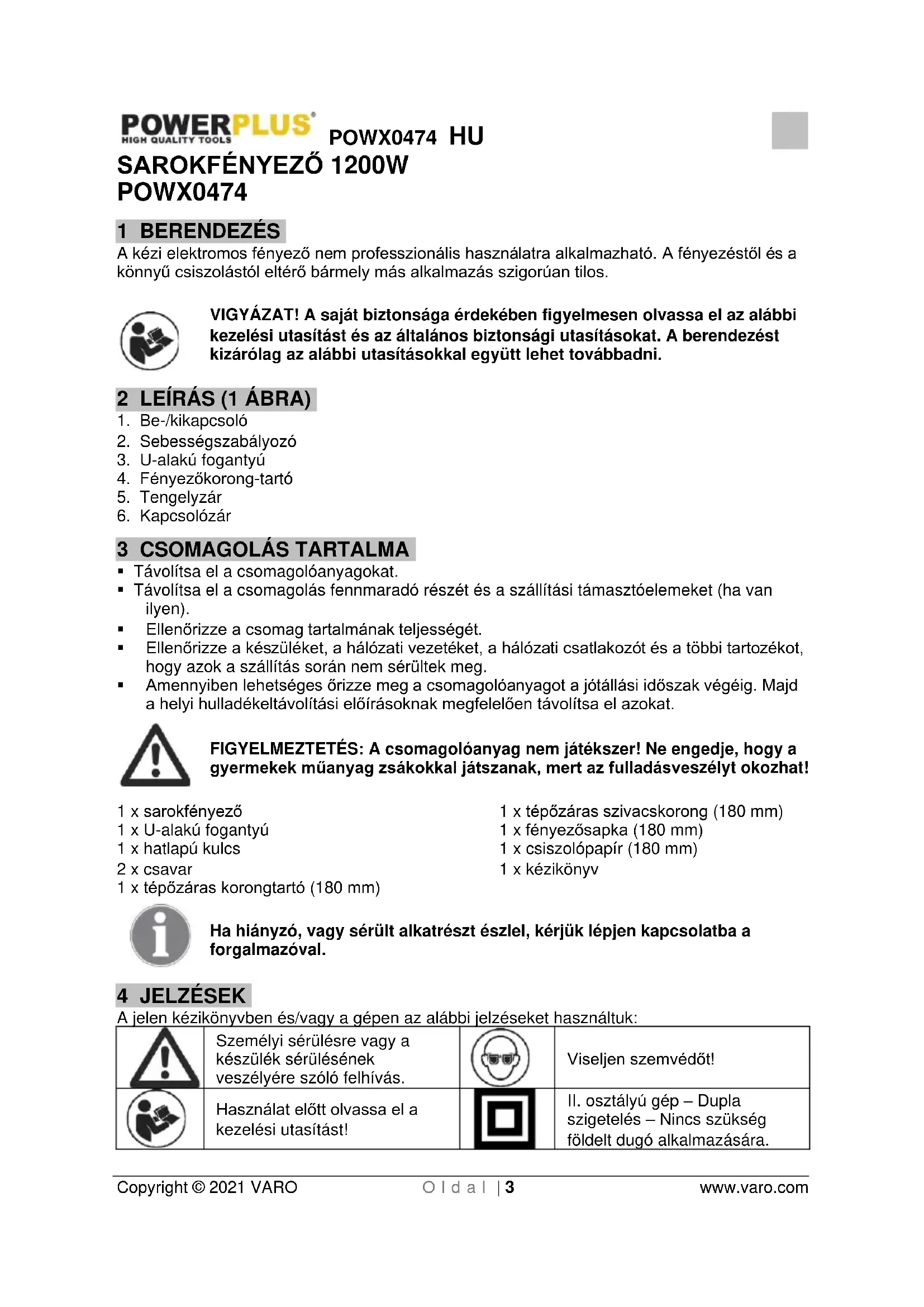 szigetelés – Nincs szükség földelt dugó alkalmazására.POWX0474 HU Copyright © 2021 VARO O l d a l | 4 www.varo.com