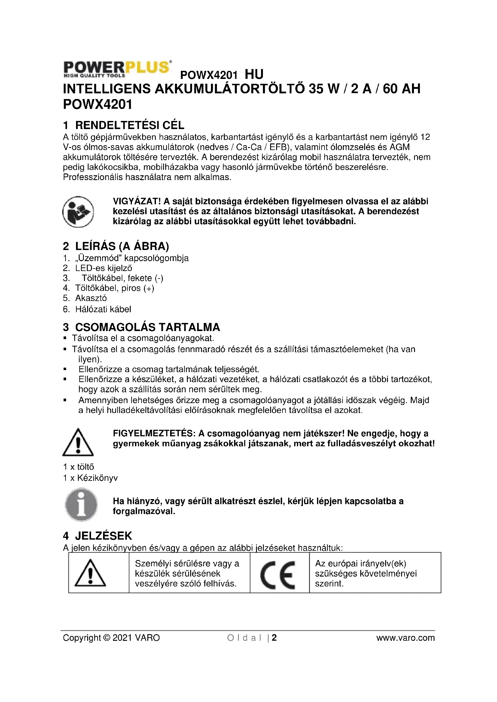 - VARO-Vic. Van Rompuy N.V. - Joseph Van Instraat 9 - BE2500 Lier - BELGIUM, kijelenti, hogy A termék típusa: Intelligens töltő Márkanév: POWERplus Cikkszám: POWX4201 megfelel a harmonizált európai szabványok alkalmazásán alapuló, idevonatkozó európai irányelvek alapvető követelményeinek és egyéb vonatkozó rendelkezéseinek. A készülék bármilyen illetéktelen módosítása érvényteleníti a jelen nyilatkozatot. Európai irányelvek (ideértve, adott esetben, azok módosításait az aláírás időpontjáig): 2011/65/EU 2014/30/EU 2014/35/EU Harmonizált európai szabványok (ideértve, adott esetben, azok módosításait az aláírás időpontjáig): EN60335-1 : 2012 EN60335-2-29 : 2004 EN55014-1 : 2017 EN55014-2 : 2015 EN61000-3-2 : 2014 EN61000-3-3 : 2013 A műszaki dokumentáció birtokosa: Philippe Vankerkhove, VARO - Vic. Van Rompuy N.V. Az alulírott a társaság vezérigazgatója nevében jár el, Philippe Vankerkhove Szabályozási Ügyek - Megfelelőségi Menedzser Lier, 27/11/2020POWX4201 RU Copyright © 2021 VARO С т р . | 1 www.varo.com 1 НАЗНАЧЕНИЕ p. 2