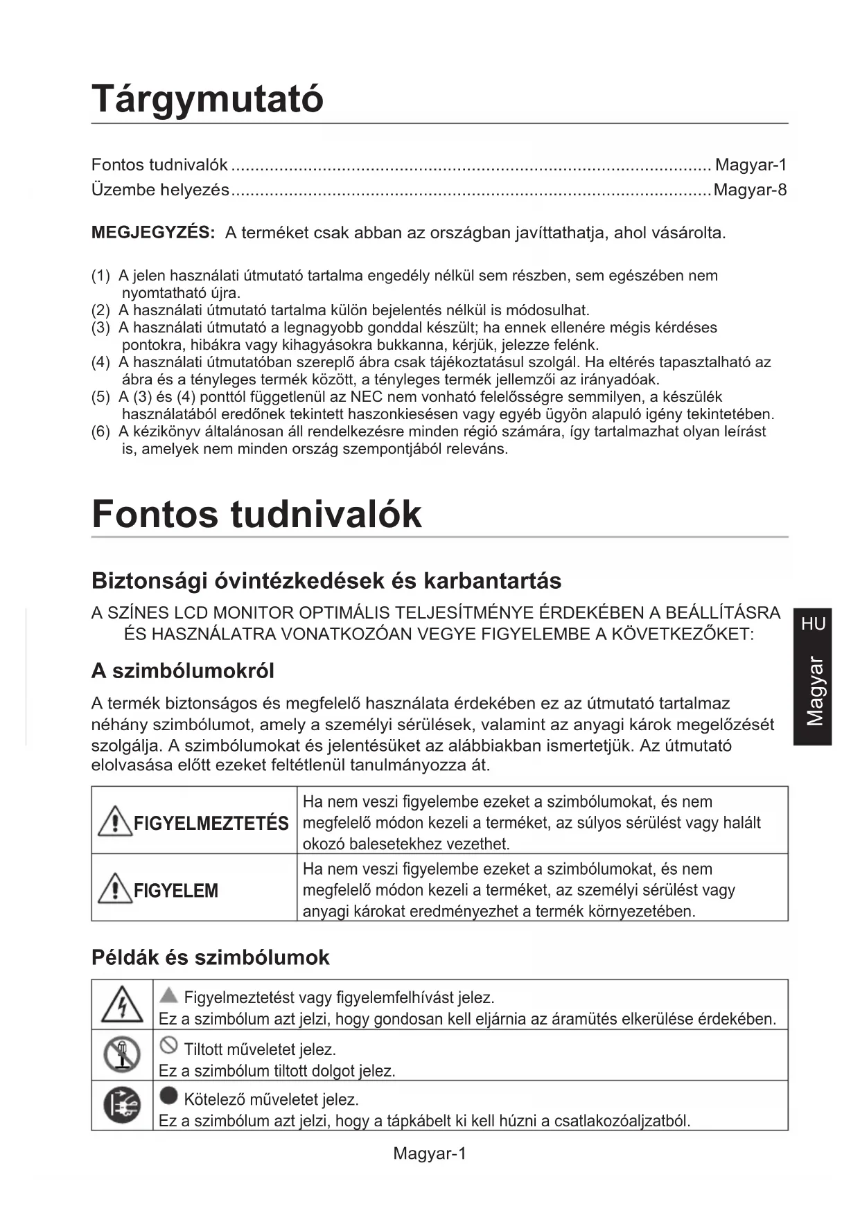 Magyar Fontos tudnivalók .................................................................................................... Magyar-1 Üzembe helyezés ....................................................................................................Magyar-8 Tárgymutató MEGJEGYZÉS: A terméket csak abban az országban javíttathatja, ahol vásárolta. (1) A jelen használati útmutató tartalma engedély nélkül sem részben, sem egészében nem nyomtatható újra.(2) A használati útmutató tartalma külön bejelentés nélkül is módosulhat.(3) A használati útmutató a legnagyobb gonddal készült; ha ennek ellenére mégis kérdéses pontokra, hibákra vagy kihagyásokra bukkanna, kérjük, jelezze felénk.(4) A használati útmutatóban szereplő ábra csak tájékoztatásul szolgál. Ha eltérés tapasztalható az ábra és a tényleges termék között, a tényleges termék jellemzői az irányadóak.(5) A (3) és (4) ponttól függetlenül az NEC nem vonható felelősségre semmilyen, a készülék használatából eredőnek tekintett haszonkiesésen vagy egyéb ügyön alapuló igény tekintetében.(6) A kézikönyv általánosan áll rendelkezésre minden régió számára, így tartalmazhat olyan leírást is, amelyek nem minden ország szempontjából releváns. Fontos tudnivalók Biztonsági óvintézkedések és karbantartás A SZÍNES LCD MONITOR OPTIMÁLIS TELJESÍTMÉNYE ÉRDEKÉBEN A BEÁLLÍTÁSRA ÉS HASZNÁLATRA VONATKOZÓAN VEGYE FIGYELEMBE A KÖVETKEZŐKET: A szimbólumokról A termék biztonságos és megfelelő használata érdekében ez az útmutató tartalmaz néhány szimbólumot, amely a személyi sérülések, valamint az anyagi károk megelőzését szolgálja. A szimbólumokat és jelentésüket az alábbiakban ismertetjük. Az útmutató elolvasása előtt ezeket feltétlenül tanulmányozza át. FIGYELMEZTETÉS Ha nem veszi gyelembe ezeket a szimbólumokat, és nem megfelelő módon kezeli a terméket, az súlyos sérülést vagy halált okozó balesetekhez vezethet. FIGYELEM Ha nem veszi gyelembe ezeket a szimbólumokat, és nem megfelelő módon kezeli a terméket, az személyi sérülést vagy anyagi károkat eredményezhet a termék környezetében. Példák és szimbólumok Figyelmeztetést vagy gyelemfelhívást jelez. Ez a szimbólum azt jelzi, hogy gondosan kell eljárnia az áramütés elkerülése érdekében. Tiltott műveletet jelez. Ez a szimbólum tiltott dolgot jelez. Kötelező műveletet jelez. Ez a szimbólum azt jelzi, hogy a tápkábelt ki kell húzni a csatlakozóaljzatból.Magyar-2 FIGYELMEZTETÉS