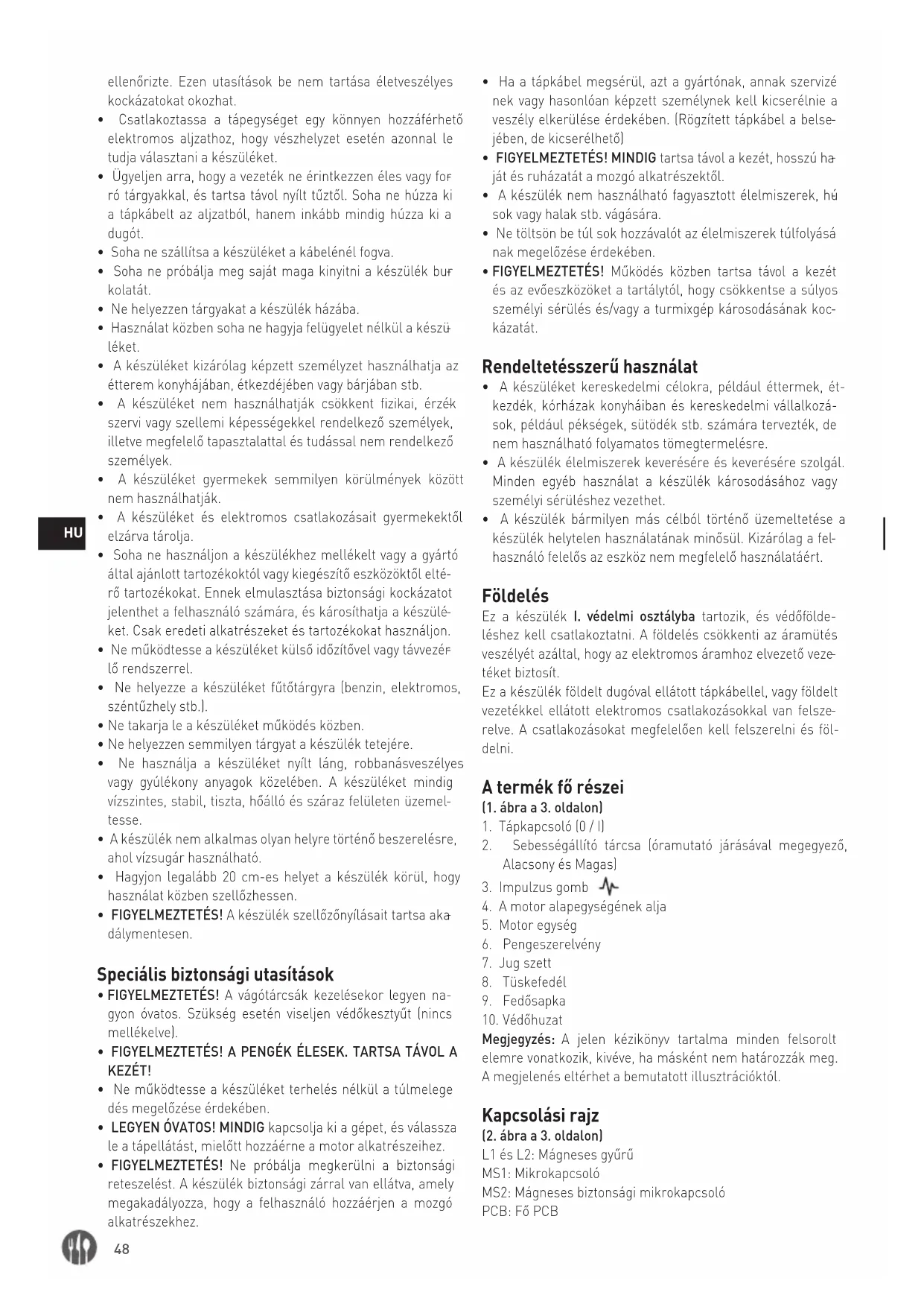 Megjegyzés: A jelen kézikönyv tartalma minden felsorolt elemre vonatkozik, kivéve, ha másként nem határozzák meg. A megjelenés eltérhet a bemutatott illusztrációktól. Kapcsolási rajz (2. ábra a 3. oldalon) L1 és L2: Mágneses gyűrű MS1: Mikrokapcsoló MS2: Mágneses biztonsági mikrokapcsoló PCB: Fő PCB49