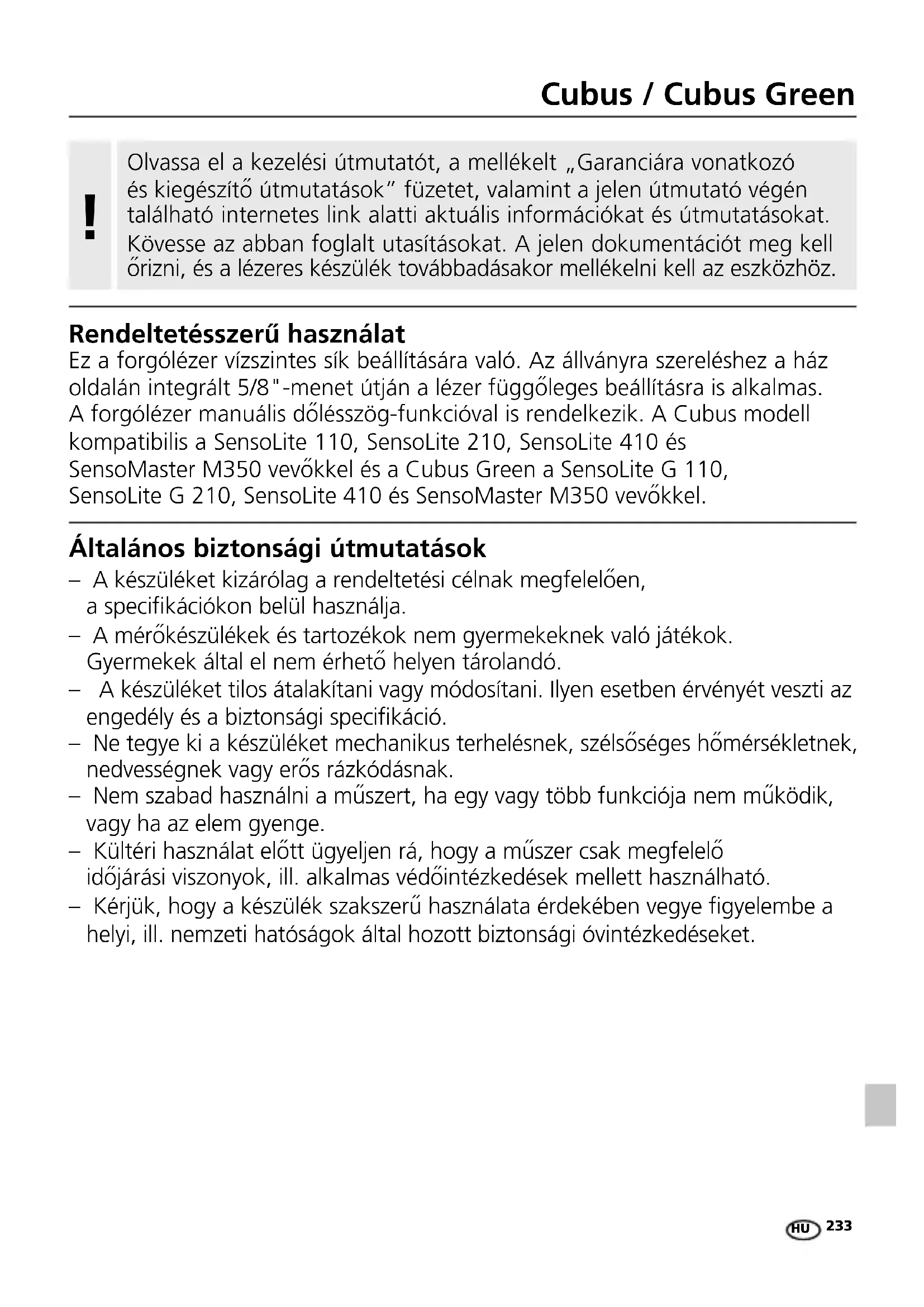 Rendeltetésszerű használat Ez a forgólézer vízszintes sík beállítására való. Az állványra szereléshez a ház oldalán integrált 5/8"-menet útján a lézer függőleges beállításra is alkalmas. A forgólézer manuális dőlésszög-funkcióval is rendelkezik. A Cubus modell kompatibilis a SensoLite 110, SensoLite 210, SensoLite 410 és SensoMaster M350 vevőkkel és a Cubus Green a SensoLite G 110, SensoLite G 210, SensoLite 410 és SensoMaster M350 vevőkkel. Általános biztonsági útmutatások – A készüléket kizárólag a rendeltetési célnak megfelelően, a specikációkon belül használja. – A mérőkészülékek és tartozékok nem gyermekeknek való játékok. Gyermekek által el nem érhető helyen tárolandó. – A készüléket tilos átalakítani vagy módosítani. Ilyen esetben érvényét veszti az engedély és a biztonsági specikáció. – Ne tegye ki a készüléket mechanikus terhelésnek, szélsőséges hőmérsékletnek, nedvességnek vagy erős rázkódásnak. – Nem szabad használni a műszert, ha egy vagy több funkciója nem működik, vagy ha az elem gyenge. – Kültéri használat előtt ügyeljen rá, hogy a műszer csak megfelelő időjárási viszonyok, ill. alkalmas védőintézkedések mellett használható. – Kérjük, hogy a készülék szakszerű használata érdekében vegye gyelembe a helyi, ill. nemzeti hatóságok által hozott biztonsági óvintézkedéseket. Olvassa el a kezelési útmutatót, a mellékelt „Garanciára vonatkozó és kiegészítő útmutatások” füzetet, valamint a jelen útmutató végén található internetes link alatti aktuális információkat és útmutatásokat. Kövesse az abban foglalt utasításokat. A jelen dokumentációt meg kell őrizni, és a lézeres készülék továbbadásakor mellékelni kell az eszközhöz.