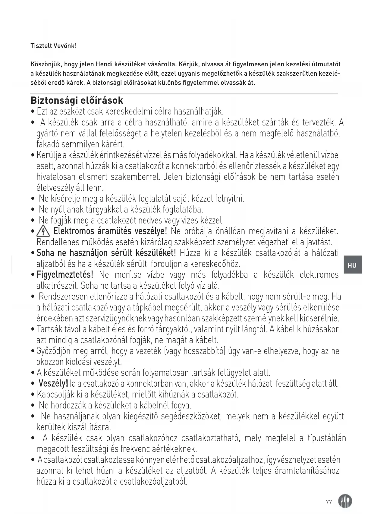 Tisztelt Vevőnk! Köszönjük, hogy jelen Hendi készüléket vásárolta. Kérjük, olvassa át figyelmesen jelen kezelési útmutatót a készülék használatának megkezdése előtt, ezzel ugyanis megelőzhetők a készülék szakszerűtlen kezelé- séből eredő károk. A biztonsági előírásokat különös figyelemmel olvassák át. Biztonsági előírások