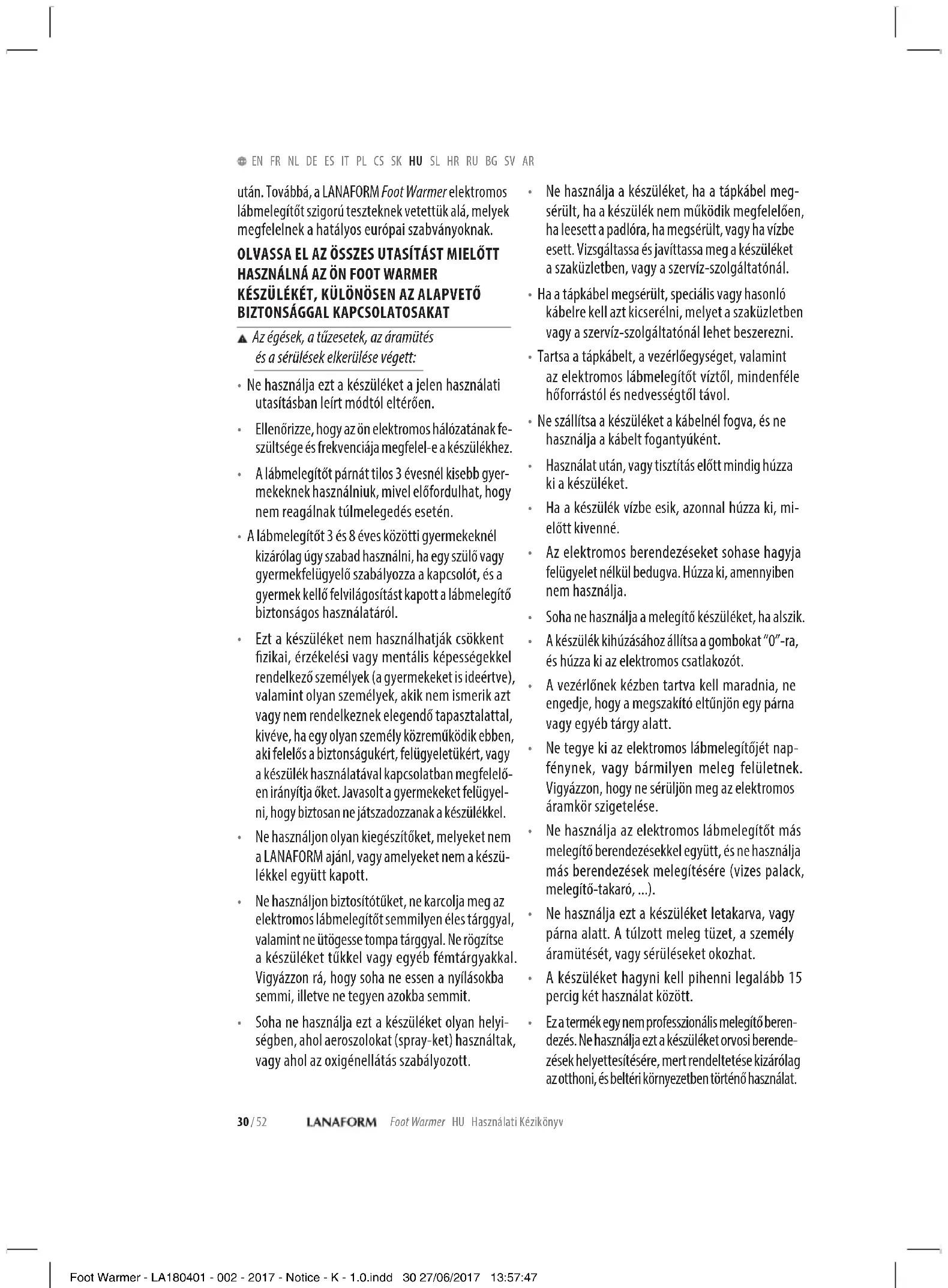 Spoločnosť LANAFORM sa zaručuje, že tento výrobok je bez akejkoľvek chyby materiálu či spracovania, a to od dátumu predaja po dobu dvoch rokov, s výnimkou nižšie uvedených prípadov. Záruka spoločnosti LANAFORM sa nevzťahuje na škody spôsobené bežným používaním tohto výrob- ku. Okrem iného sa záruka v rámci tohto výroku spoločnosti LANAFORM nevzťahuje na škody spô- sobené chybným nebo nevhodným používaním či akýmkoľvek chybným užívaním, nehodou, pripoje- ním nedovolených doplnkov, zmenou realizovanou na výrobku či iným zásahom akejkoľvek povahy, na ktorý nemá spoločnosť LANAFORM vplyv. Spoločnosť LANAFORM nebude zodpovedná za žiadny druh poškodenia príslušenstva (následný alebo špeciálny). Všetky záruky týkajúce sa spôsobilosti výrobku sú obmedzené na obdobie dvoch rokov od prvej kúpi pod podmienkou, že pri reklamácii je treba predložiť doklad o kúpe tohto tovaru. Po prijatí prístroja ho spoločnosť LANAFORM opraví alebo vymení v závislosti od prípadu a následne vám ho vráti. Záručný servis poskytuje iba servisné stredisko spoločnosti LANAFORM. V prípade, že akú- koľvek údržbu tohto prístroja zveríte inej osobe ako servisnému stredisku spoločnosti LANAFORM, táto záruka stráca platnosť. HU Használati Kézikönyv A termék jelen kézikönyvben és a csomagoláson szereplő fotói és más ábrázolásai a lehető leghívebben igyekeznek tükrözni a valóságot, de nem garantálják a termékkel való tökéletes hasonlóságot. Köszönjük, hogy a LANAFORM Foot Warmer elektro- mos lábmelegítőjét választotta. A Foot Warmer egy három intenzitási fokozattal és LED állapotjelzővel ellátott elektromos lábmelegítő. Ez a berendezés hozzásegíti önt, hogy lábait mele- gen tartsa. Ezen kívül az elektromos lábmelegítő fokozatos hőmérséklet-szabályozást biztosít, ezál- tal nemcsak a téli felmelegedést, hanem a nedves, esős időben a kellemes meleget is lehetővé teszi az ön számára. A kényelmesen és egyszerűen használható Foot Warmer csupán néhány perc használat alatt kelle- mes meleget biztosít önnek. Mi több, egy könnyen használható vezérlő segítségével üzemeltetheti, mely kényelmesen belefekszik az ön tenyerébe. A Foot Warmer használható az irodában, vagy otthon ... A termék használata közbeni biztonság érdekében ezt a készüléket túlmelegedés elleni védelemmel láttuk el, valamint rendelkezik egy olyan berende- zéssel, mely a készüléket leállítja 90 perc használat Foot Warmer - LA180401 - 002 - 2017 - Notice - K - 1.0.indd 29 27/06/2017 13:57:4730 / 52 Foot Warmer HU Használati Kézikönyv EN FR NL DE ES IT PL CS SK HU SL HR RU BG SV AR után. Továbbá, a LANAFORM Foot Warmer elektromos lábmelegítőt szigorú teszteknek vetettük alá, melyek megfelelnek a hatályos európai szabványoknak. OLVASSA EL AZ ÖSSZES UTASÍTÁST MIELŐTT