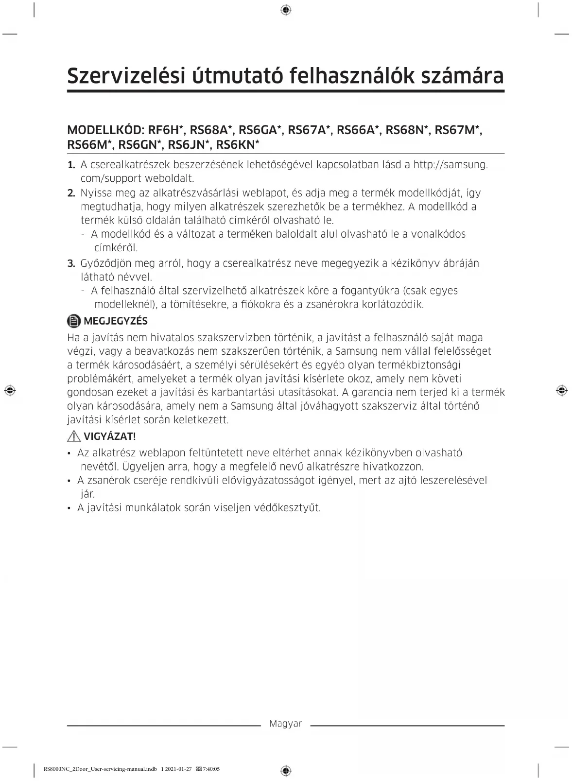 látható névvel. - A felhasználó által szervizelhető alkatrészek köre a fogantyúkra (csak egyes modelleknél), a tömítésekre, a ókokra és a zsanérokra korlátozódik. MEGJEGYZÉS Ha a javítás nem hivatalos szakszervizben történik, a javítást a felhasználó saját maga végzi, vagy a beavatkozás nem szakszerűen történik, a Samsung nem vállal felelősséget a termék károsodásáért, a személyi sérülésekért és egyéb olyan termékbiztonsági problémákért, amelyeket a termék olyan javítási kísérlete okoz, amely nem követi gondosan ezeket a javítási és karbantartási utasításokat. A garancia nem terjed ki a termék olyan károsodására, amely nem a Samsung által jóváhagyott szakszerviz által történő javítási kísérlet során keletkezett. VIGYÁZAT!