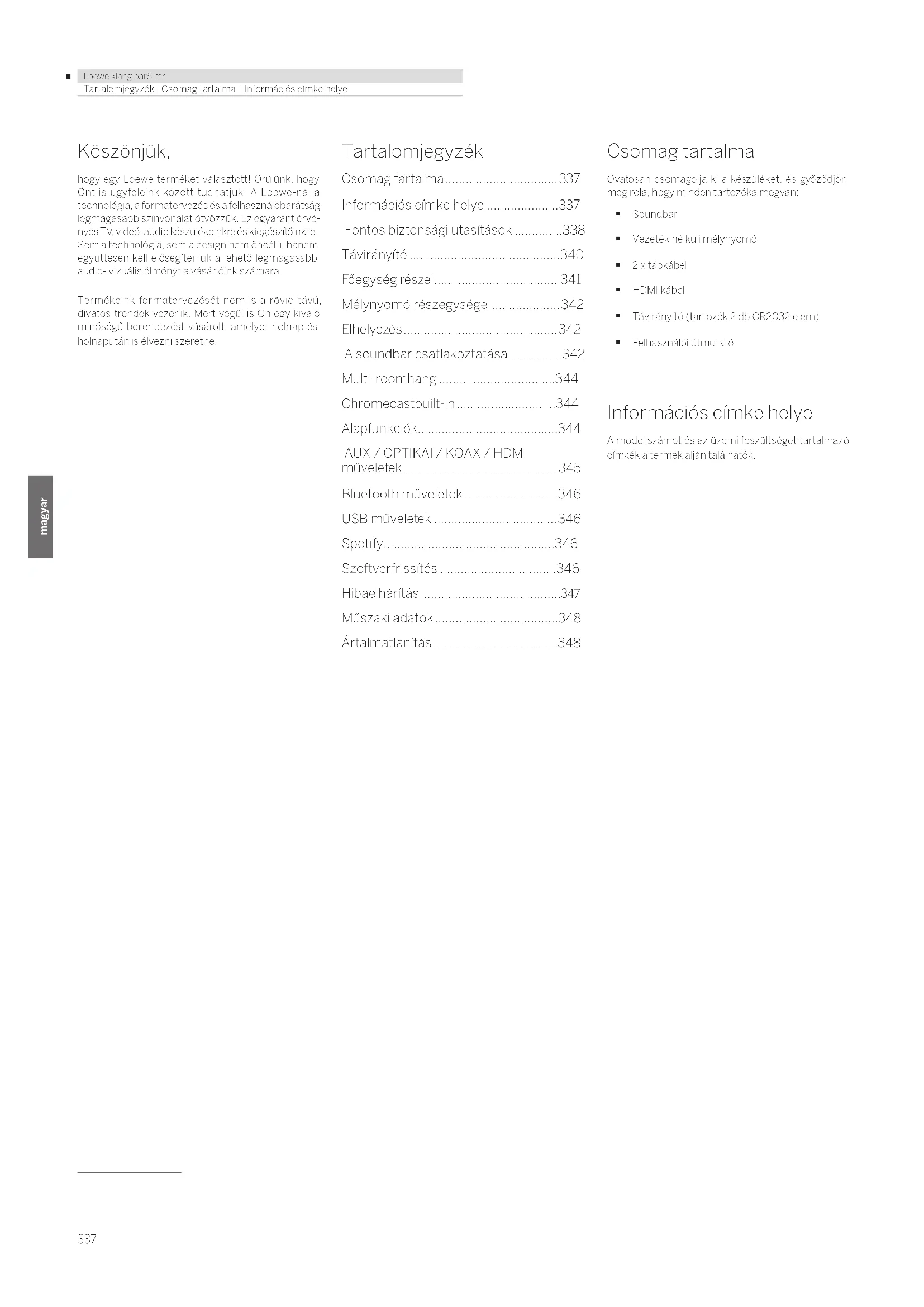 - Loewe klang bar5 mr magyar Tartalomjegyzék | Csomag tartalma | Információs címke helye Köszönjük, hogy egy Loewe terméket választott! Örülünk, hogy Önt is ügyfeleink között tudhatjuk! A Loewe-nál a technológia, a formatervezés és a felhasználóbarátság legmagasabb színvonalát ötvözzük. Ez egyaránt érvé- nyes TV, videó, audio készülékeinkre és kiegészítőinkre. Sem a technológia, sem a design nem öncélú, hanem együttesen kell elősegíteniük a lehető legmagasabb audio- vizuális élményt a vásárlóink számára. Termékeink formatervezését nem is a rövid távú, divatos trendek vezérlik. Mert végül is Ön egy kiváló minőségű berendezést vásárolt, amelyet holnap és holnapután is élvezni szeretne. Csomag tartalma Óvatosan csomagolja ki a készüléket, és győződjön meg róla, hogy minden tartozéka megvan: Soundbar Vezeték nélküli mélynyomó 2 x tápkábel HDMI kábel Távirányító (tartozék 2 db CR2032 elem) Felhasználói útmutató Információs címke helye A modellszámot és az üzemi feszültséget tartalmazó címkék a termék alján találhatók. Tartalomjegyzék Csomag tartalma p. 337
