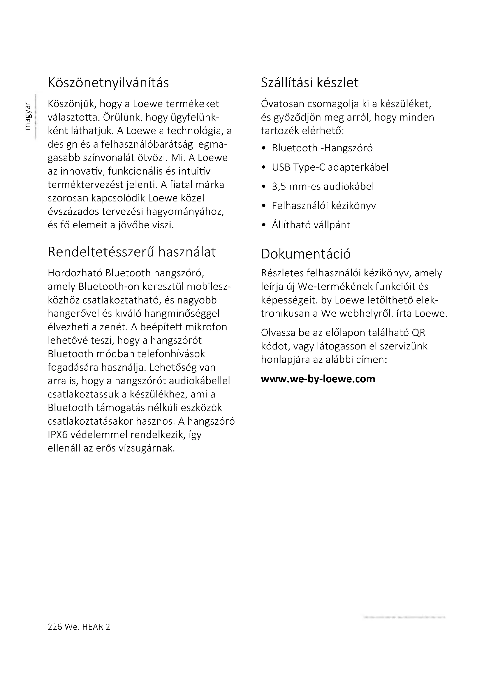 kialszik. 9 Víz elleni védelem IPX6 Ez a készülék IPX6 védelemmel ren- delkezik, ami azt jelen, hogy az erős vízsugár nem lesz rá káros hatással. Ahhoz, hogy ez a védelem hatékony legyen, nem szabad külső eszközöket kábelekkel a hangszóróhoz csatlakoz- tatni (például telefont audiokábellel vagy töltőt USB-kábellel), és a csatlakozórekeszt biztonságosan le kell zárni.232 We. HEAR 2 magyar Hibaelhárítás A készülék meghibásodása esetén javasoljuk, hogy a segélyvonal felhívása elő tekintse át az alábbi listát. Probléma Lehetséges ok Elhárítási mód/megjegyzések A hangszóró nem kapcsol be. Az akkumulátor nagyon lemerülőben van. A hangszóró töltése. A hangszóró töltési ideje túl hosszú. Az USB-töltő túl kevés áramot ad le. Használjon 5V/2A USB-töltőt. A hangszóróból nem jön hang a. A hangerő túl halk vagy el van némítva. b. A hangszóróhoz nincs párosíto eszköz. a. Nyomja meg többször a hangerő (+) gombot, vagy növelje a hangerőt az eszközön. b. Csatlakozzon és csatlakoz- zon Bluetooth-eszközéhez. Torzíto hangzás a. A Bluetooth-eszköz túl messze van a hangszórótól b. Vezeték nélküli interferen- cia van jelen a. Vigye közelebb a készüléket a hangszóróhoz b. Vigye távolabb a hangszórót a többi vezeték nélküli eszköztől. Műszaki adatok Készülék típusa We. by Loewe: We. HEAR 2 Аrt. №: 60702x10 Akkumulátor típusa: Beépített lítium-ion 7,4 V/4000 mAh Töltőáram: 5 V / 2A Lejátszás időtartama: 15 – 17 óra Töltési idő: 4 – 5 óra Hangszóró 2x 15 W RMS Víz elleni védelem IPX6 Bluetooth verzió V5.0 Bluetooth teljesítmény/frekvencia tartomány: Maximális teljesítmény <10 mW 2402-2480 MHz esetén Bluetooth protokollok: A2DP, AVRCP A készülék méretei (Sz x Ma x M): 118 x 290 x 112 mm A készülék súlya: 2 kg Környezeti hőmérséklet: 0° C – 40° C Relatív páratartalom (kondenzáció nélkül): 20 – 70%We. HEAR 2 233 magyar234 We. HEAR 2 srpski Hvala što ste izabrali We. by Loewe proizvod. Drago nam je što ste naš kupac. U Loewe-u kombinujemo najviše standarde tehnologije, dizajna i lakoće upotrebe. We. by Loewe označava ino- vavan, funkcionalan i intuivan dizajn proizvoda. Mladi brend je usko povezan sa Loewe-ovom skoro stogodišnjom tradicijom dizajna i prenosi svoje ključne elemente u budućnost. Namena Prenosivi Bluetooth zvučnik koji možete upari sa Bluetooth mobilnim uređajem i uživa u muzici pri većoj jačini zvuka i odličnom kvalitetu zvuka. Ugrađeni mikrofon vam omogućava da koriste zvučnik za odgovaranje na telefonske pozive u Bluetooth režimu. Postoji i opcija za povezivanje zvučnika sa uređa- jem pomoću audio kabla, što je korisno za povezivanje uređaja bez Bluetooth podrške. Zvučnik ima IPX6 zaštu, što ga čini otpornim na jake vodene mlazove. Obim isporuke Pažljivo raspakujte uređaj i uverite se da li je sva dodatna oprema prisutna: