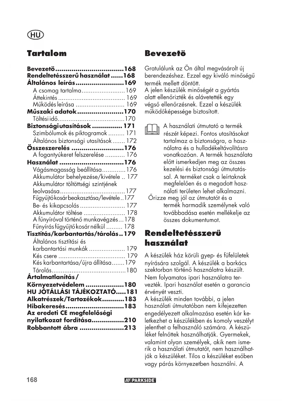 - Bevezetö Gratulálunk az Ön által megvásárolt új berendezéshez. Ezzel egy kiváló minőségű termék mellett döntött. A jelen készülék minőségét a gyártás alatt ellenőrizték és alávetették egy végső ellenőrzésnek. Ezzel a készülék működőképessége biztosított. A használati útmutató a termék részét képezi. Fontos utasításokat tartalmaz a biztonságra, a hasz- nálatra és a hulladékeltávolításra vonatkozóan. A termék használata előtt ismerkedjen meg az összes kezelési és biztonsági útmutatás- sal. A terméket csak a leírtaknak megfelelően és a megadott hasz- nálati területen lehet alkalmazni. Őrizze meg jól az útmutatót és a termék harmadik személynek való továbbadása esetén mellékelje az összes dokumentumot. Rendeltetésszerű használat A készülék ház körüli gyep- és fűfelületek nyírására szolgál. A készülék a barkács szektorban történő használatra készült. Nem folyamatos ipari használatra ter- vezték. Ipari használat esetén a garancia érvényét veszti. A készülék minden további, a jelen használati útmutatóban nem kifejezetten engedélyezett alkalmazása esetén kár ke- letkezhet a készülékben és komoly veszélyt jelenthet a felhasználó számára. A készü- léket felnőttek használhatják. Gyermekek, valamint olyan személyek, akik nem isme- rik a használati útmutatót, nem használhat- ják a készüléket. Tilos a készüléket esőben vagy párás környezetben használni. A Az eredeti CE megfelelőségi nyilatkozat fordítása p. 210
