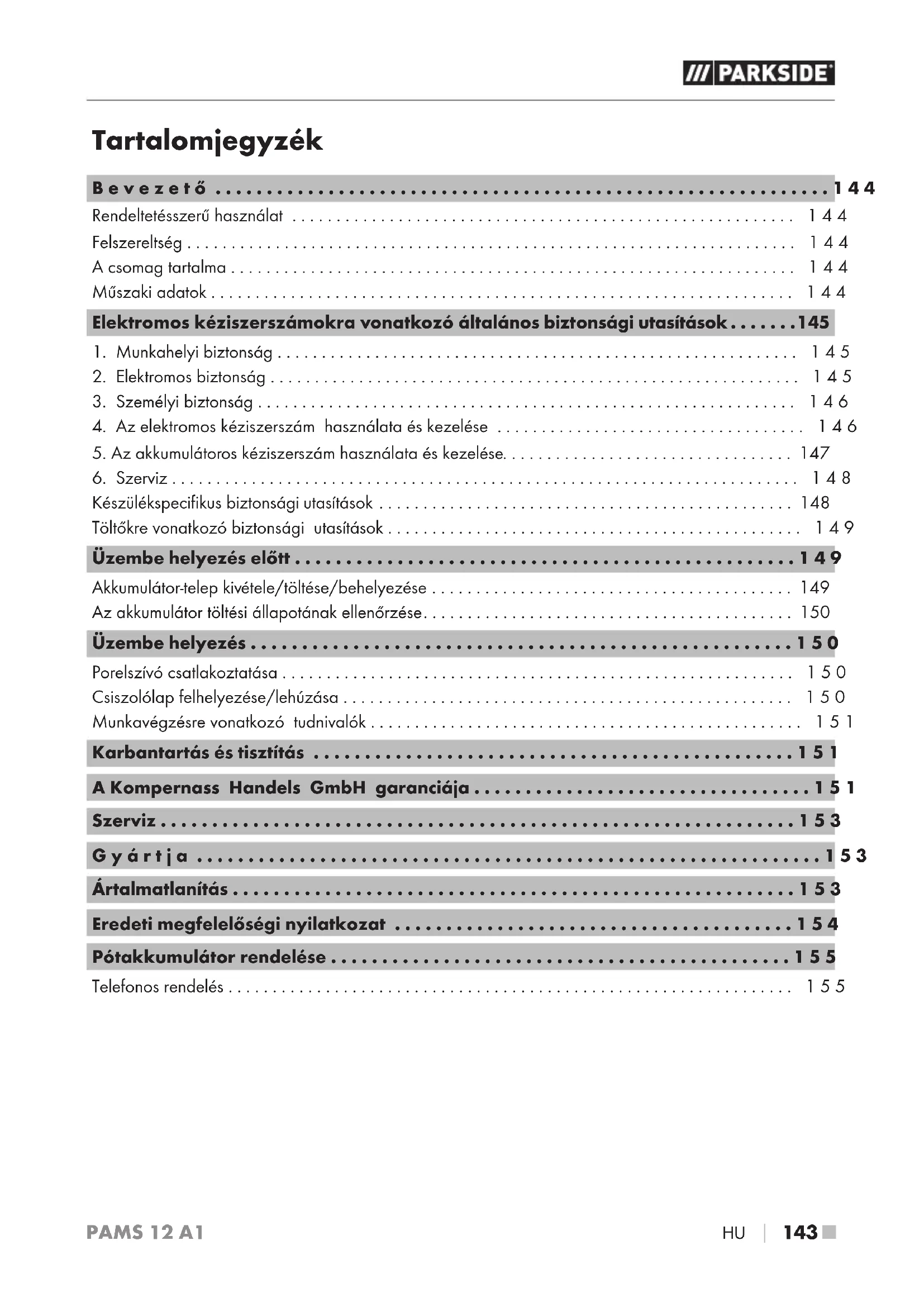 HASZNÁLATI ÚTMUTATÓ PAMS 12 A1 PARKSIDE