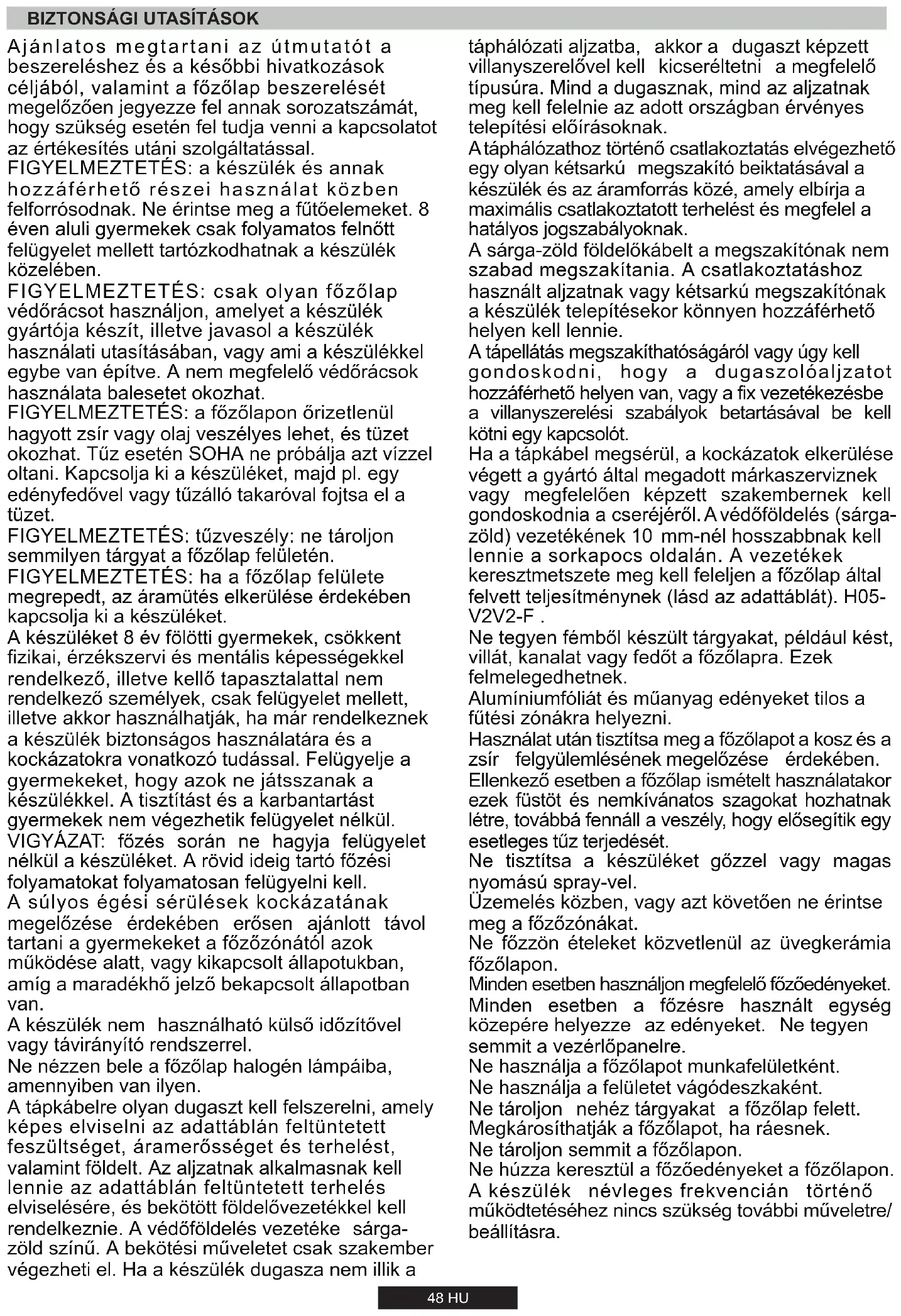 Ajánlatos megtartani az útmutatót a beszereléshez és a későbbi hivatkozások céljából, valamint a főzőlap beszerelését megelőzően jegyezze fel annak sorozatszámát, hogy szükség esetén fel tudja venni a kapcsolatot az értékesítés utáni szolgáltatással. FIGYELMEZTETÉS: a készülék és annak hozzáférhető részei használat közben felforrósodnak. Ne érintse meg a fűtőelemeket. 8 éven aluli gyermekek csak folyamatos felnőtt felügyelet mellett tartózkodhatnak a készülék közelében. FIGYELMEZTETÉS: csak olyan főzőlap védőrácsot használjon, amelyet a készülék gyártója készít, illetve javasol a készülék használati utasításában, vagy ami a készülékkel egybe van építve. A nem megfelelő védőrácsok használata balesetet okozhat. FIGYELMEZTETÉS: a főzőlapon őrizetlenül hagyott zsír vagy olaj veszélyes lehet, és tüzet okozhat. Tűz esetén SOHA ne próbálja azt vízzel oltani. Kapcsolja ki a készüléket, majd pl. egy edényfedővel vagy tűzálló takaróval fojtsa el a tüzet. FIGYELMEZTETÉS: tűzveszély: ne tároljon semmilyen tárgyat a főzőlap felületén. FIGYELMEZTETÉS: ha a főzőlap felülete megrepedt, az áramütés elkerülése érdekében kapcsolja ki a készüléket. A készüléket 8 év fölötti gyermekek, csökkent fizikai, érzékszervi és mentális képességekkel rendelkező, illetve kellő tapasztalattal nem rendelkező személyek, csak felügyelet mellett, illetve akkor használhatják, ha már rendelkeznek a készülék biztonságos használatára és a kockázatokra vonatkozó tudással. Felügyelje a gyermekeket, hogy azok ne játsszanak a készülékkel. A tisztítást és a karbantartást gyermekek nem végezhetik felügyelet nélkül. VIGYÁZAT: főzés során ne hagyja felügyelet nélkül a készüléket. A rövid ideig tartó főzési folyamatokat folyamatosan felügyelni kell. A súlyos égési sérülések kockázatának megelőzése érdekében erősen ajánlott távol tartani a gyermekeket a főzőzónától azok működése alatt, vagy kikapcsolt állapotukban, amíg a maradékhő jelző bekapcsolt állapotban van. A készülék nem használható külső időzítővel vagy távirányító rendszerrel. Ne nézzen bele a főzőlap halogén lámpáiba, amennyiben van ilyen. A tápkábelre olyan dugaszt kell felszerelni, amely képes elviselni az adattáblán feltüntetett feszültséget, áramerősséget és terhelést, valamint földelt. Az aljzatnak alkalmasnak kell lennie az adattáblán feltüntetett terhelés elviselésére, és bekötött földelővezetékkel kell rendelkeznie. A védőföldelés vezetéke sárga- zöld színű. A bekötési műveletet csak szakember végezheti el. Ha a készülék dugasza nem illik a