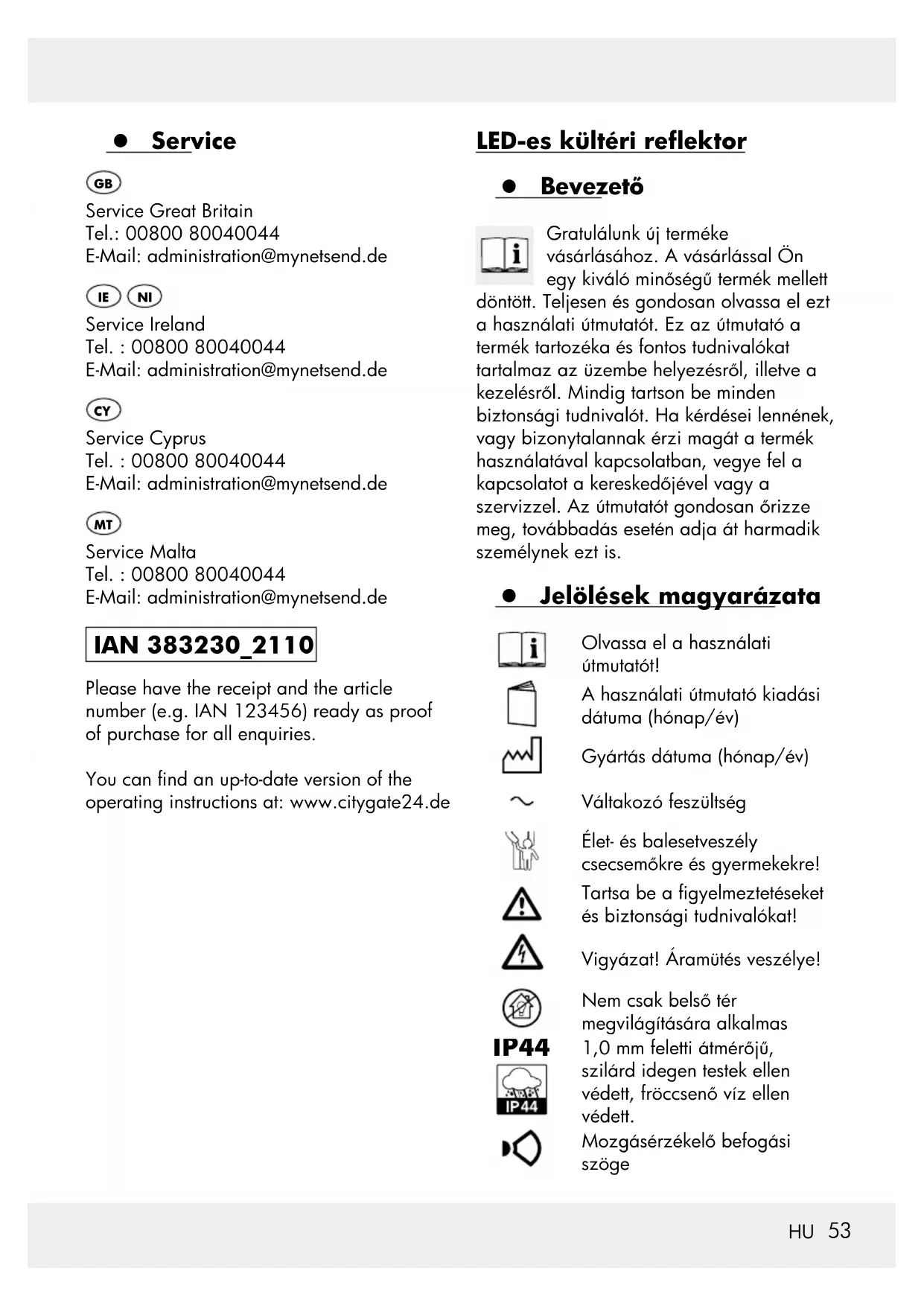 Service Malta Tel. : 00800 80040044 E-Mail: administration@mynetsend.de IAN 383230_2110 Please have the receipt and the article number (e.g. IAN 123456) ready as proof of purchase for all enquiries. You can nd an up-to-date version of the operating instructions at: www.citygate24.de LED-es kültéri reektor z Bevezető Gratulálunk új terméke vásárlásához. A vásárlással Ön egy kiváló minőségű termék mellett döntött. Teljesen és gondosan olvassa el ezt a használati útmutatót. Ez az útmutató a termék tartozéka és fontos tudnivalókat tartalmaz az üzembe helyezésről, illetve a kezelésről. Mindig tartson be minden biztonsági tudnivalót. Ha kérdései lennének, vagy bizonytalannak érzi magát a termék használatával kapcsolatban, vegye fel a kapcsolatot a kereskedőjével vagy a szervizzel. Az útmutatót gondosan őrizze meg, továbbadás esetén adja át harmadik személynek ezt is. z Jelölések magyarázata Olvassa el a használati útmutatót! A használati útmutató kiadási dátuma (hónap/év) Gyártás dátuma (hónap/év) Váltakozó feszültség Élet- és balesetveszély csecsemőkre és gyermekekre! Tartsa be a gyelmeztetéseket és biztonsági tudnivalókat! Vigyázat! Áramütés veszélye! Nem csak belső tér megvilágítására alkalmas IP44 1,0 mm feletti átmérőjű, szilárd idegen testek ellen védett, fröccsenő víz ellen védett. Mozgásérzékelő befogási szöge54