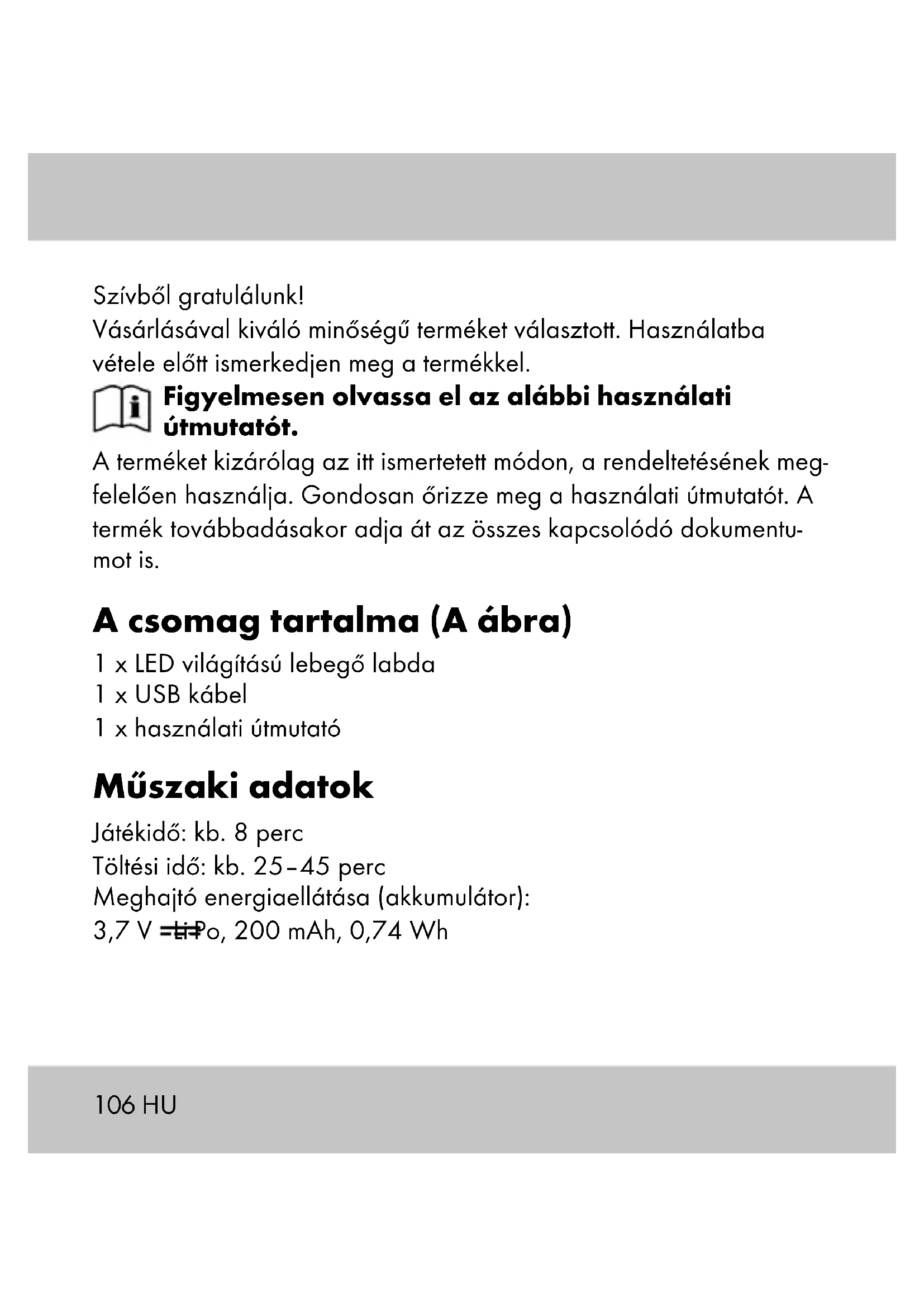 a LED-fénysáv (1c) rövid villogás után kialszik. A termék készenléti állapotba kapcsol. Megjegyzés: a gombot (1b) akkor is megnyomhatja, ha a rotorlapátok forgása már leállt. Ne dobja a terméket a padlóra. Tárolás, tisztítás A terméket mindig száraz, tiszta és szobahőmérsékletű helyen tárolja, ha azt nem használja. Csak nedves törlőkendővel tisztítsa meg, utána törölje szárazra. FONTOS! Ne használjon éles tisztítószereket a tisztításhoz.112 HU Tudnivalók a hulladékkezelésről Az oldalsó szimbólum azt jelzi, hogy a készülék a 2012/19/ EU irányelv hatálya alá tartozik. Ez az irányelv kimondja, hogy ezt a készüléket a hasznos élettartamának végén nem szabad a normál háztartási hulladékkal együtt ártalmatlanítani, hanem a speciálisan erre a célra kialakított gyűjtőhelyeken, újrahasznosító központokban vagy hulladékfeldolgozóknál kell leadni őket. Óvja a környezetet és ártalmatlanítsa szakszerűen a terméket. Az elemeket/akkumulátorokat tilos a háztartási hulladékokkal együtt kidobni. Ugyanis mérgező nehézfémeket tartalmazhatnak, ami a különleges hulladékkezeléshez tartozik. A nehézfémek vegyjelei: Cd = kadmium, Hg = higany, Pb = ólom. Ezért a használt elemeket/ akkumulátorokat a községi gyűjtőhelyen adja le. Az elhasználódott készülék ártalmatlanításával kapcsolatos további információkat a települési vagy városi önkormányzat- tól tudhatja meg. A készüléket és a csomagolást környezetba- rát módon ártalmatlanítsa. A csomagolóanyagokat (például fóliatasakokat) tartsa távol a gyermekektől. A szelektív hulladékgyűjtés során vegye figyelembe a csomagolóanyagokon lévő jelzéseket, ahol a rövidítések (a) és számok (b) jelentése: 1–7: műanyagok / 20–22: papír és karton / 80–98: kötőanyagok.113HU A termékek és a csomagolóanyagok újrahasznosíthatók, ezért a jobb hulladékkezelés érdekében külön gyűjtse ezeket. A Triman logó csak Franciaországban érvényes. A garanciával és a szerviz lebonyolításával kapcsolatos útmutató A termék nagy gondossággal és állandó ellenőrzés mellett készült. A DELTA-SPORT HANDELSKONTOR GmbH privát végső felhasználók- nak a vásárlás dátumától számított három év (garancia időtartama) garanciát ad erre a termékre a következő rendelkezések szerint. A garancia csak anyaghibára és feldolgozási hibára érvényes. A garancia nem terjed ki a szokásos elhasználódásnak kitett, ezért kopó alkatrésznek tekintendő alkatrészekre (pl. elemek), valamint a törékeny alkatrészekre sem, például a kapcsolókra, az akkumuláto- rokra vagy az üvegből készült alkatrészekre. Kizárásra kerül a garanciaigény, ha a terméket szakszerűtlenül vagy helytelenül, nem rendeltetésszerűen vagy nem az előirányzott felhasználási körben használták, vagy figyelmen kívül hagyták a ke- zelési útmutató előírásait, kivéve, ha a végső felhasználó bizonyítja, hogy olyan anyag- vagy feldolgozási hiba áll fenn, amely nem a fent említett körülmények valamelyikéből ered.114 HU A garanciaigény csak a garancia időtartamán belül, az eredeti pénztári bizonylat bemutatásával érvényesíthető. Ezért kérjük, őrizze meg az eredeti pénztári bizonylatot. A garancia, a törvényes garancia vagy a méltányosság alapján végzett esetleges javítások a garancia időtartamát nem hosszabbítják meg. Ez vonatkozik a kicserélt és javított alkatrészekre is. Kérjük, hogy reklamáció esetén először az alábbi szervizvonalat hívja, vagy e-mailen keressen minket. Garanciális esetekben a terméket saját döntésünk alapján ingyenesen megjavítjuk, kicserél- jük vagy megtérítjük a vételárat. A garanciából további jogok nem következnek. A jelen garancia nem korlátozza az Ön törvényes jogait, különösen a mindenkori értékesítővel szembeni garanciaigényét. IAN: 419744_2201 Szerviz Magyarország Tel.: 06800 21225 E-Mail: deltasport@lidl.hu115SI Čestitamo! Z nakupom ste se odločili za visokokakovosten izdelek. Pred prvo uporabo se seznanite z izdelkom. V ta namen natančno preberite naslednje navodilo za uporabo. Izdelek uporabljajte, kot je opisano, in za navedena področja upora- be. To navodilo za uporabo skrbno hranite. Če boste izdelek predali tretjim osebam, zraven priložite vso dokumentacijo. Obseg dobave (sl. A) 1 x leteča krogla z LED-osvetlitvijo 1 x USB-kabel 1 x navodilo za uporabo Tehnični podatki Čas igranja: pribl. 8 min. Čas polnjenja: pribl. 25–45 min. Napajanje pogona (akumulatorska baterija): 3,7 V Li-Po, 200 mAh, 0,74 Wh116 SI USB-kabel (tip C): Vhod: 5 V
