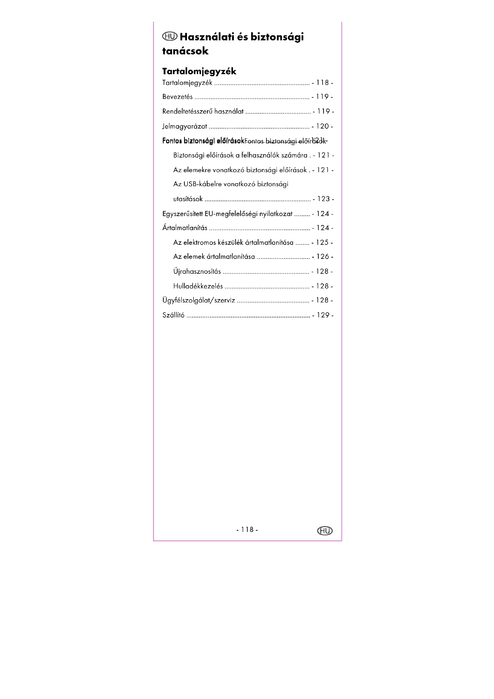 Fornitore Prendere nota che l’indirizzo seguente non è un indirizzo destinato all’assistenza. Prendere contatto dapprima con il punto di Assistenza precedentemente indicato. digi-tech gmbh Valterweg 27A 65817 Eppstein GERMANIA- 118 - Használati és biztonsági tanácsok Tartalomjegyzék Tartalomjegyzék ...................................................... - 118 - Bevezetés ................................................................. - 119 - Rendeltetésszerű használat ..................................... - 119 - Jelmagyarázat ......................................................... - 120 - Fontos biztonsági előírások Fontos biztonsági előírásokFontos biztonsági előírások Fontos biztonsági előírások ................................. - 121 - Biztonsági előírások a felhasználók számára . - 121 - Az elemekre vonatkozó biztonsági előírások . - 121 - Az USB-kábelre vonatkozó biztonsági utasítások ............................................................ - 123 - Egyszerűsített EU-megfelelőségi nyilatkozat ......... - 124 - Ártalmatlanítás ......................................................... - 124 - Az elektromos készülék ártalmatlanítása ........ - 125 - Az elemek ártalmatlanítása .............................. - 126 - Újrahasznosítás ................................................. - 128 - Hulladékkezelés ................................................ - 128 - Ügyfélszolgálat/szerviz ......................................... - 128 - Szállító ...................................................................... - 129 -- 119 -