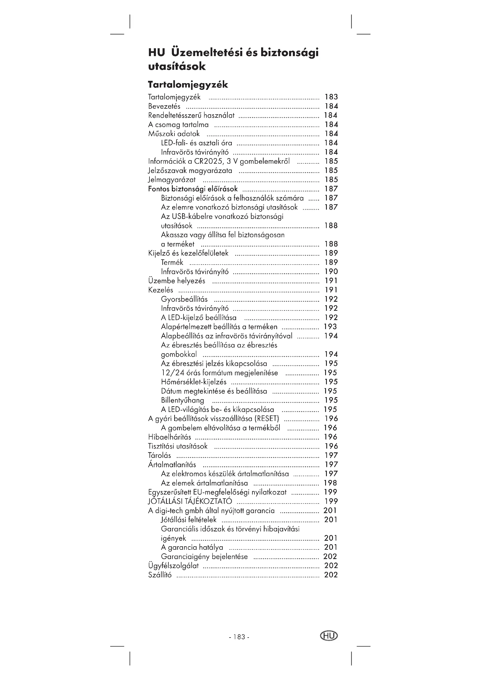 városi) kereskedelmi és iparkamarák mellett működő békéltető testület eljárását is kezdeményezheti. A jótállás a fogyasztó törvényből eredő szavatossági jogait és azok érvényesíthetőségét nem érinti. Kijavítást ellenőrző szelvény: Kijavítást ellenőrző szelvény: A jótállási igény bejelentésé- nek időpontja: A hiba oka: Javításra átvétel időpontja: A hiba javításának módja: A fogyasztó részére történő visszaadás időpontja:- 201 - A szerviz bélyegzője, kelt és aláírás: Kicserélést ellenőrző szelvény: A jótállási igény bejelentésének időpontja: Kicserélés időpontja: A cserélő bolt bélyegzője, kelt és aláírás: A digi-tech gmbh által nyújtott garancia Erre az eszközre 3 éves garanciát nyújtunk, amely a vá- sárlás napjával veszi kezdetét. A készülék hibái esetén törvényes jogai vannak az eszköz eladójával szemben. Ezeket a törvényes jogokat az alábbiakban meghatározott garanciánk nem korlátozza. Jótállási feltételek A garancia időtartama a vásárlás napján kezdődik. Kérjük, őrizze meg a nyugtát. Ez a dokumentum a vásárlás igazolásához szükséges. Ha az eszköz meg- vásárlásától számított három éven belül anyag- vagy gyártási hiba jelentkezik, az eszközt - saját választá- sunk szerint - ingyenesen megjavítjuk vagy kicseréljük. Ez a garancia megköveteli, hogy a hibás eszközt és a vásárlási bizonylatot (nyugtát) a hároméves időtarta- mon belül be kell mutatni, és írásban röviden le kell írni a hiba jellegét és időpontját. Ha a hibára vonatkozik a garancia, akkor a javított vagy új eszközt visszakapja. Nem kezdődik új garanciális időszak a készülék javítá- sával vagy cseréjével. Garanciális időszak és törvényi hibajavítási igények A garancia nyújtása nem hosszabbítja meg a garancia időtartamát. Ez vonatkozik a kicserélt és javított alka- trészekre is. A vásárláskor már meglévő sérüléseket vagy hibákat a kicsomagolás után azonnal jelenteni kell. A garancia lejárta után elvégzett javítások díjhoz kötöttek. A garancia hatálya A készüléket gondosan gyártották, szigorú minőségi irányelvek szerint, és a szállítás előtt gondosan ellenő- rizték. A garancia anyaghibákra vagy gyártási hibákra vonatkozik. Ez a garancia nem vonatkozik a termék azon részeire, amelyek normális kopásnak vannak kité- ve, ezért kopó alkatrészeknek vagy törékeny alkatrés- zek károsodásának tekinthetők, pl. kapcsolók, elemek vagy üvegből készült részek. Ez a garancia érvény- telen, ha az eszközt megrongálják, nem megfelelően használják vagy tartják karban. A készülék megfelelő használatához szigorúan be kell tartani az üzemelte- tési utasításban megadott összes utasítást. Feltétlenül kerülje azokat a felhasználási célokat és kezelési mó- dokat, amelyeket a használati útmutató nem tanácsol, vagy amelyekkel kapcsolatban figyelmeztet. A készülé- ket kizárólag magán- és nem kereskedelmi használatra szánják. A garancia lejár olyan visszaélésszerű vagy helytelen kezelés, erőalkalmazás és olyan beavat- kozások esetén, amelyeket nem hivatalos szervizünk hajtott végre.- 202 - Garanciaigény bejelentése Garanciaigényének gyors kezeléséhez, kérjük, a kö- vetkezök szerint járjon el: