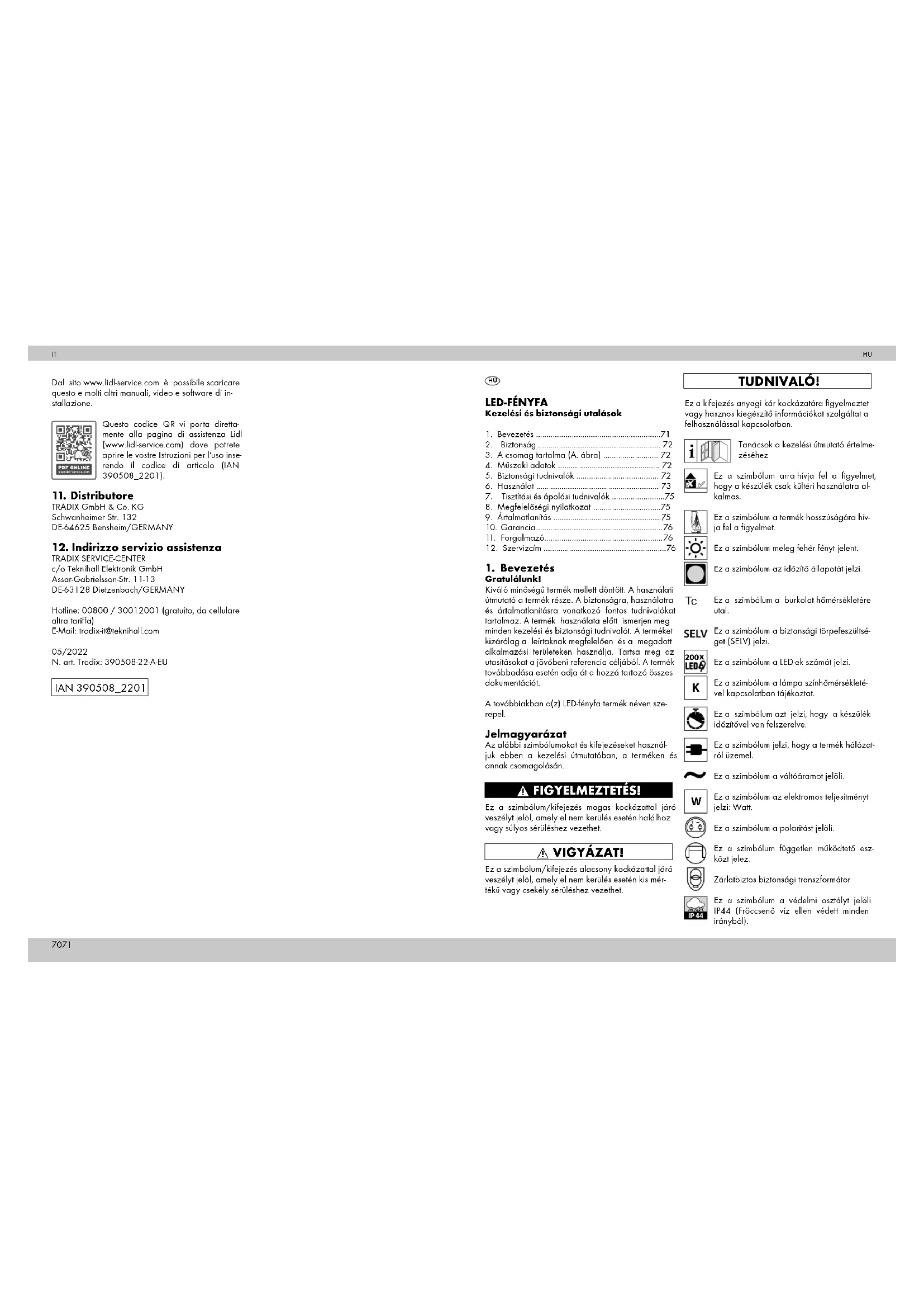 TRADIX SERVICE-CENTER c/o Teknihall Elektronik GmbH Assar-Gabrielsson-Str. 11-13 DE-63128 Dietzenbach/GERMANY Hotline: 00800 / 30012001 (gratuito, da cellulare altra tariffa) E-Mail: tradix-it@teknihall.com 05/2022 N. art. Tradix: 390508-22-A-EU IAN 390508_2201 IT72 73 Ez a szimbólum a II védelmi osztályt jelöli. CSAK A HÁLÓZATI TÁPEGYSÉGRE VO- NATKOZIK! Ez a szimbólum a III védelmi osztályt jelöli. SELV: biztonságos extra alacsony feszültség CSAK A FÉNYFÜZÉRRE ÉRVÉNYES!