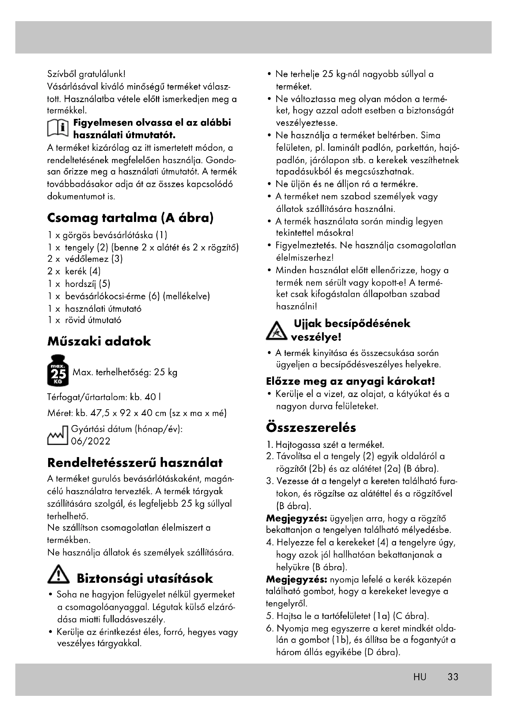Max. terhelhetőség: 25 kg Térfogat/űrtartalom: kb. 40 l Méret: kb. 47,5 x 92 x 40 cm (sz x ma x mé) Gyártási dátum (hónap/év): 06/2022 Rendeltetésszerű használat A terméket gurulós bevásárlótáskaként, magán- célú használatra tervezték. A termék tárgyak szállítására szolgál, és legfeljebb 25 kg súllyal terhelhető. Ne szállítson csomagolatlan élelmiszert a termékben. Ne használja állatok és személyek szállítására. Biztonsági utasítások