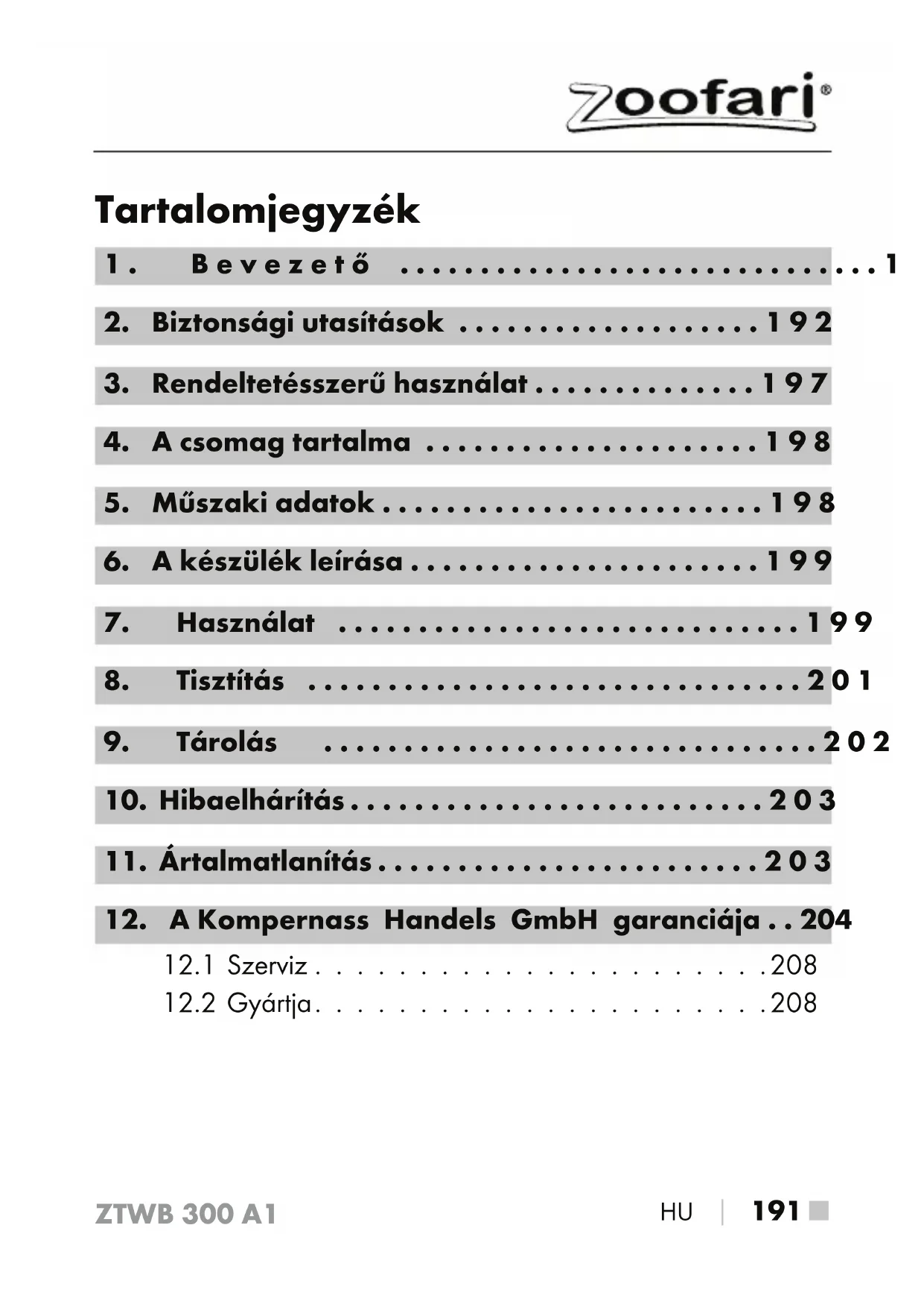 HASZNÁLATI ÚTMUTATÓ ZTWB 300 A1 ZOOFARI