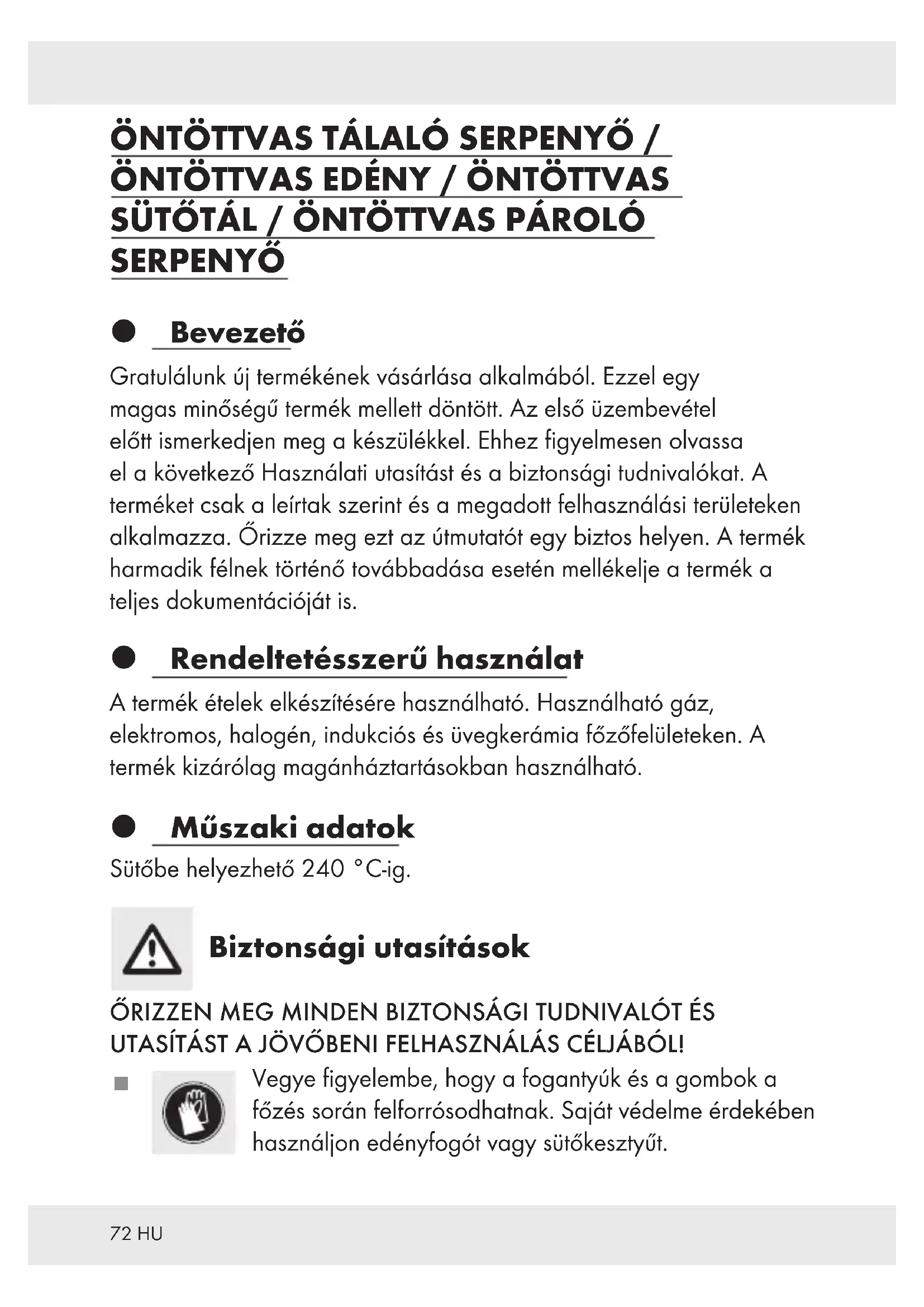 SÜTŐTÁL / ÖNTÖTTVAS PÁROLÓ SERPENYŐ Bevezető Gratulálunk új termékének vásárlása alkalmából. Ezzel egy magas minőségű termék mellett döntött. Az első üzembevétel előtt ismerkedjen meg a készülékkel. Ehhez figyelmesen olvassa el a következő Használati utasítást és a biztonsági tudnivalókat. A terméket csak a leírtak szerint és a megadott felhasználási területeken alkalmazza. Őrizze meg ezt az útmutatót egy biztos helyen. A termék harmadik félnek történő továbbadása esetén mellékelje a termék a teljes dokumentációját is. Rendeltetésszerű használat A termék ételek elkészítésére használható. Használható gáz, elektromos, halogén, indukciós és üvegkerámia főzőfelületeken. A termék kizárólag magánháztartásokban használható. Műszaki adatok Sütőbe helyezhető 240°C-ig. Biztonsági utasítások ŐRIZZEN MEG MINDEN BIZTONSÁGI TUDNIVALÓT ÉS UTASÍTÁST A JÖVŐBENI FELHASZNÁLÁS CÉLJÁBÓL!