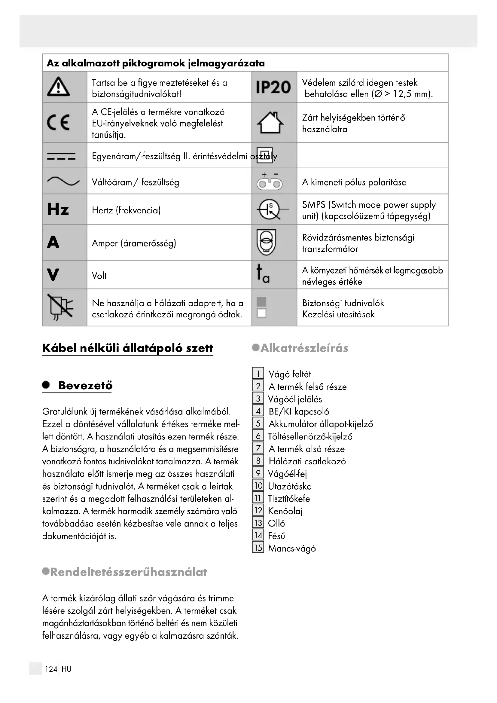 abb névleges értéke Ne használja a hálózati adaptert, ha a csatlakozó érintkezői megrongálódtak. Biztonsági tudnivalók Kezelési utasítások Kábel nélküli állatápoló szett Bevezető Gratulálunk új termékének vásárlása alkalmából. Ezzel a döntésével vállalatunk értékes terméke mel- lett döntött. A használati utasítás ezen termék része. A biztonságra, a használatára és a megsemmisítésre vonatkozó fontos tudnivalókat tartalmazza. A termék használata előtt ismerje meg az összes használati és biztonsági tudnivalót. A terméket csak a leírtak szerint és a megadott felhasználási területeken al- kalmazza. A termék harmadik személy számára való továbbadása esetén kézbesítse vele annak a teljes dokumentációját is. Rendeltetésszerű használat A termék kizárólag állati szőr vágására és trimme- lésére szolgál zárt helyiségekben. A terméket csak magánháztartásokban történő beltéri és nem közületi felhasználásra, vagy egyéb alkalmazásra szánták. Alkatrészleírás